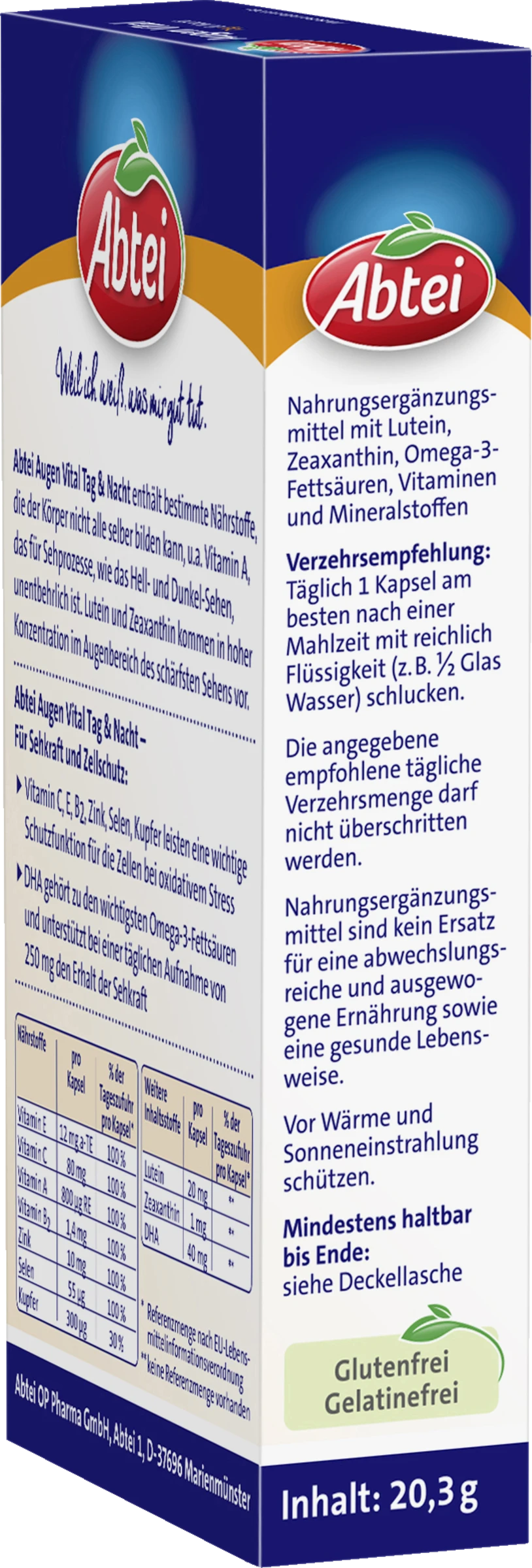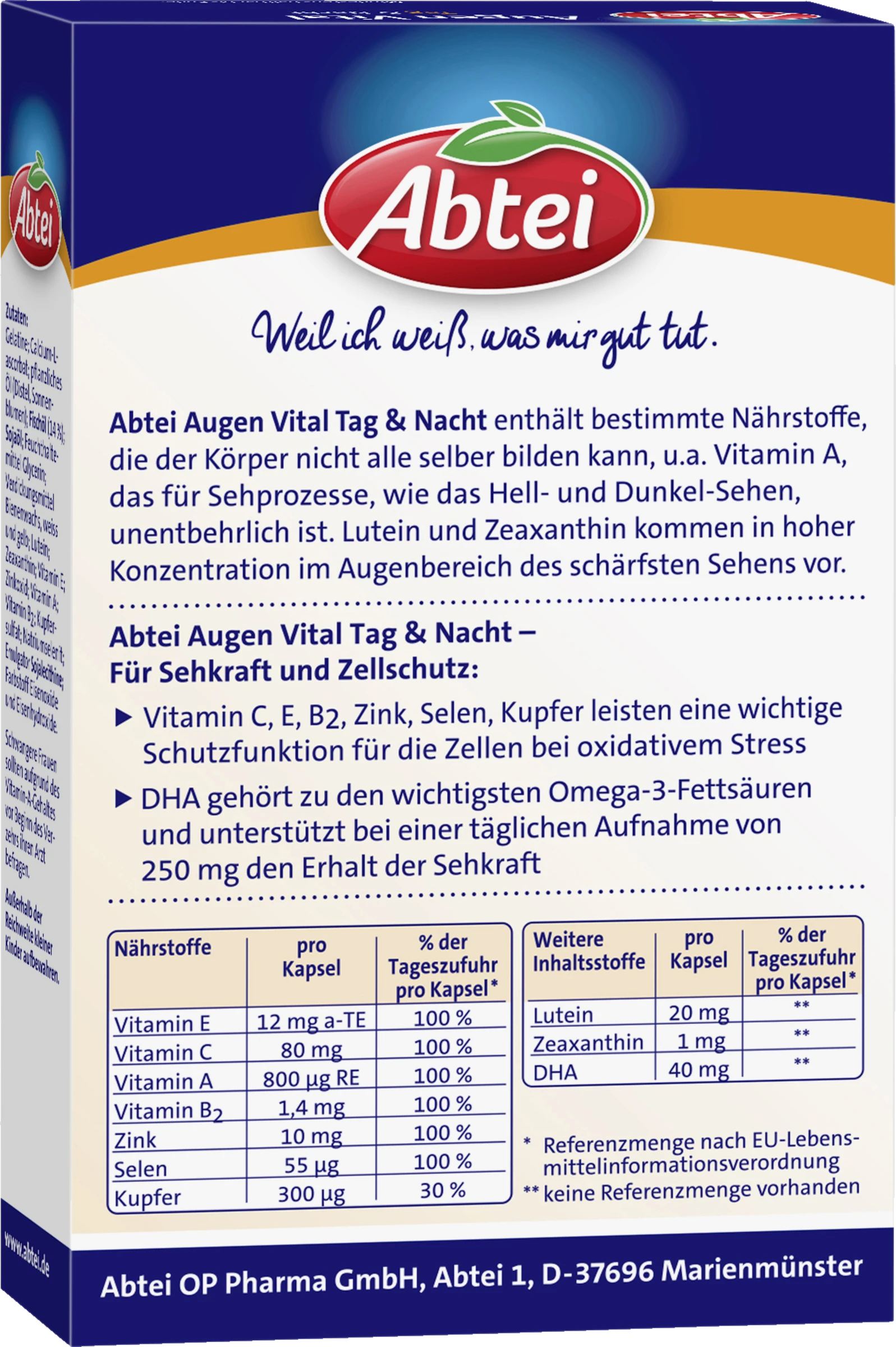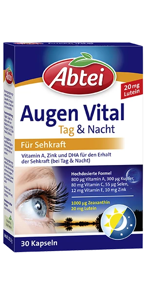Abtei Augen Vital Tag & Nacht enthält bestimmte Nährstoffe, die der Körper nicht alle selber bilden kann, u.a. Vitamin A, das für Sehprozesse, wie das Hell- und Dunkel-Sehen, unentbehrlich ist. Lutein und Zeaxanthin kommen in hoher Konzentration im Augenbereich des schärfsten Sehens vor.