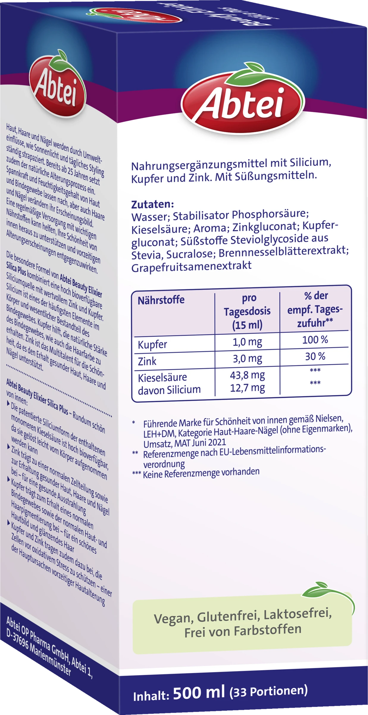 Nahrungsergänzungsmittel mit Silicium, Kupfer und Zink. Mit Süßungsmitteln.