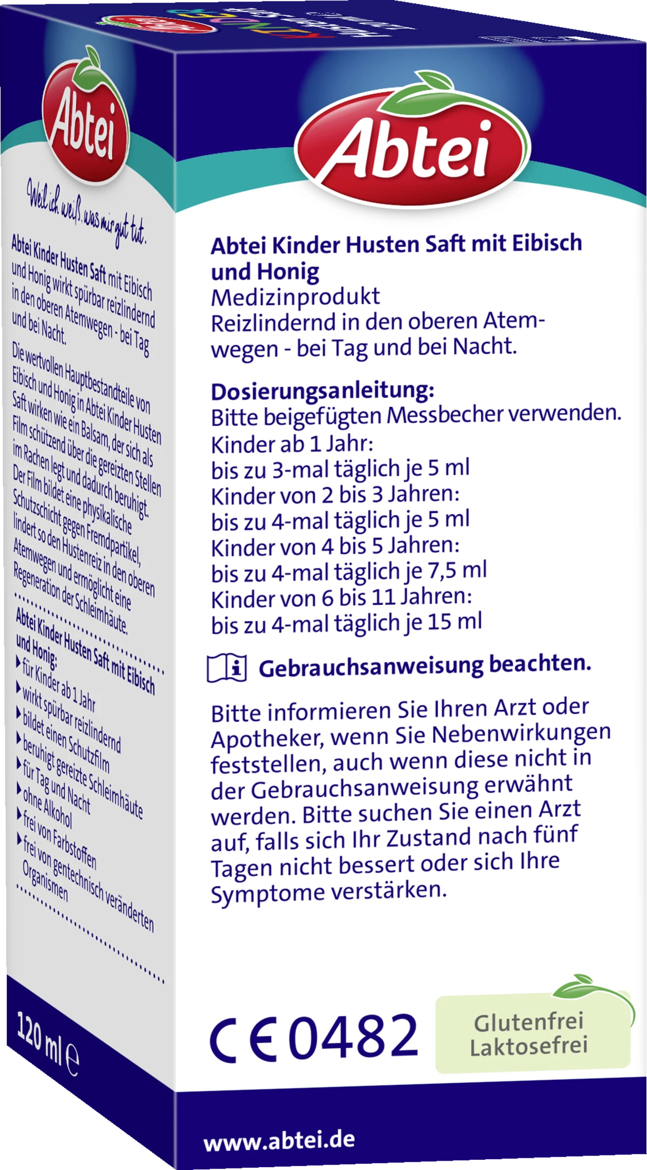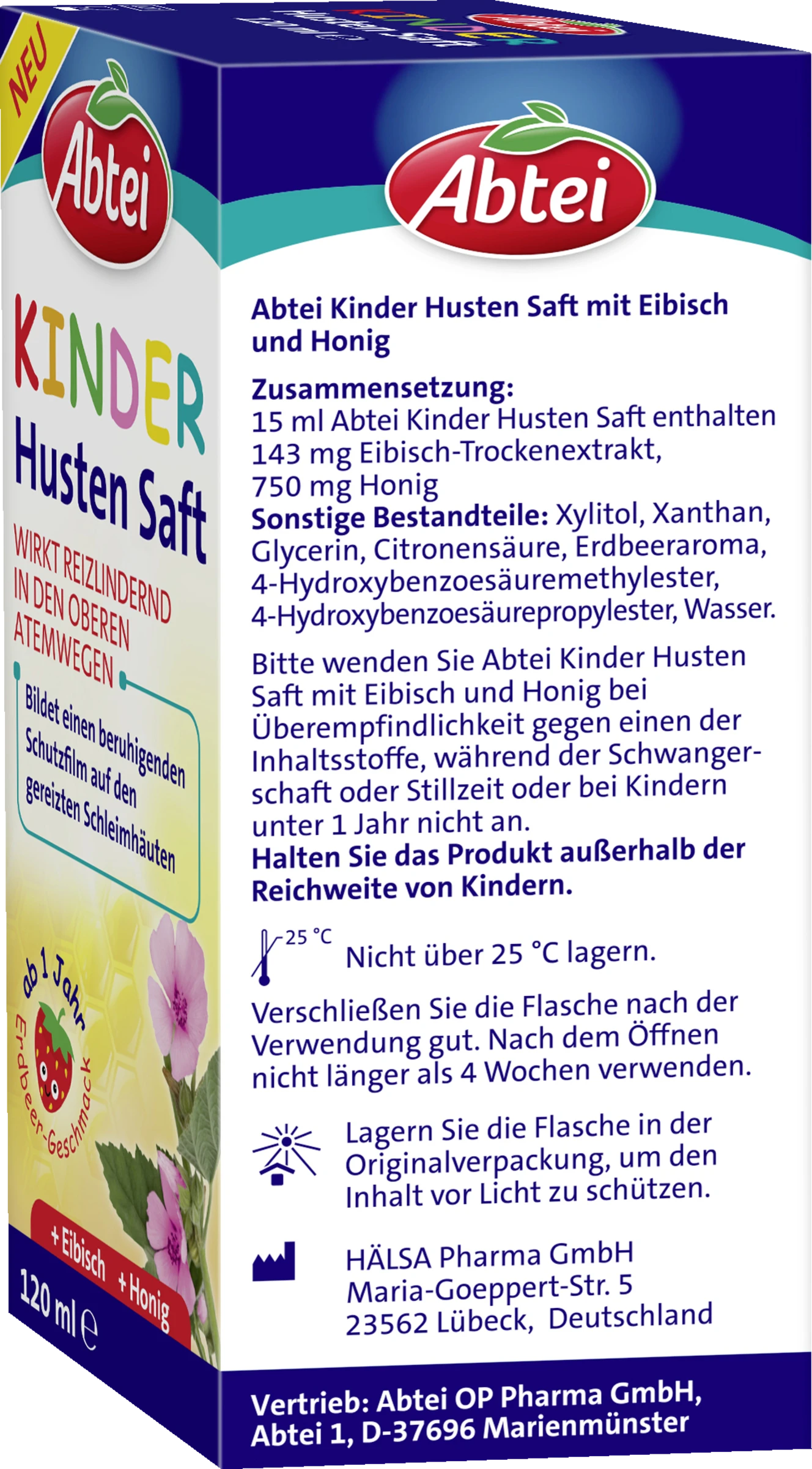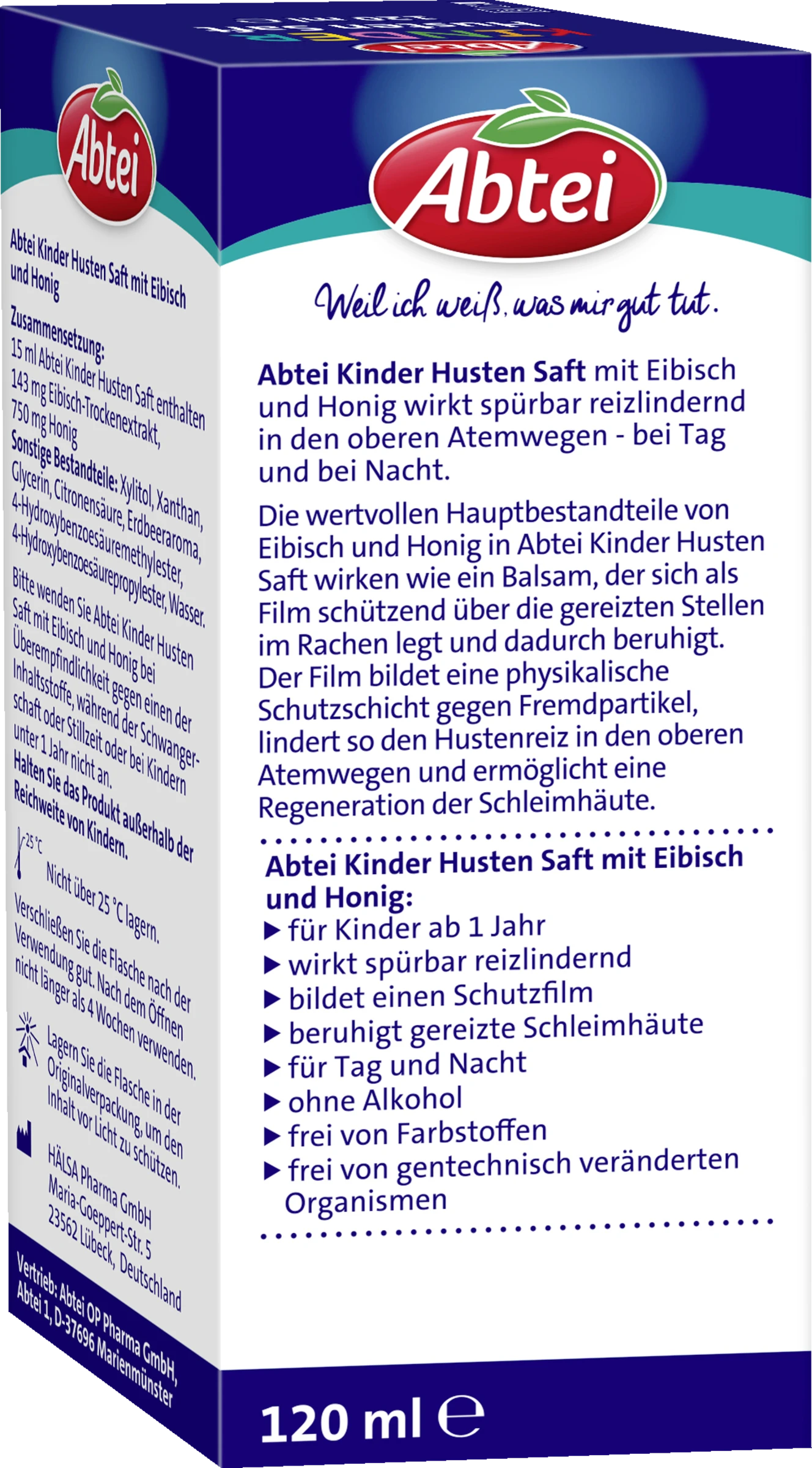 Abtei Kinder Husten Saft mit Eibisch und Honig wirkt spürbar reizlindernd in den oberen Atemwegen – bei Tag und bei Nacht.