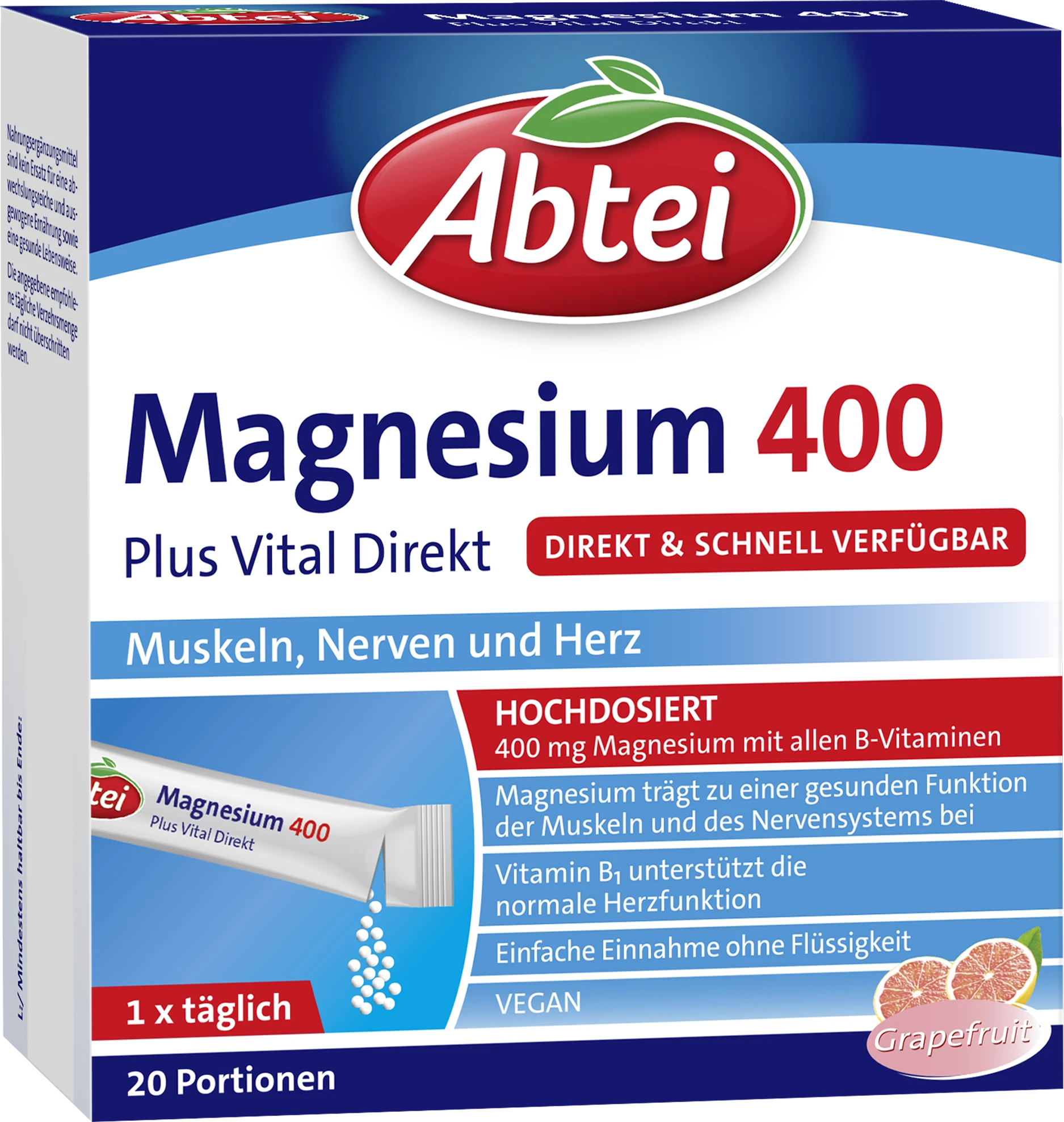 Ob beim Sport, bei körperlichen Belastungen oder in Stresssituationen: Leistungsfähigkeit, Energie und starke Nerven sind gefordert- wo auch immer Sie sich gerade befinden. Abtei Magnesium 400 Plus Vital Direkt unterstützt mit hochdosiertem Magnesium die Muskelfunktion sowie in Kombination mit Vitamin B2, B6, B12 die Nervenfunktion.