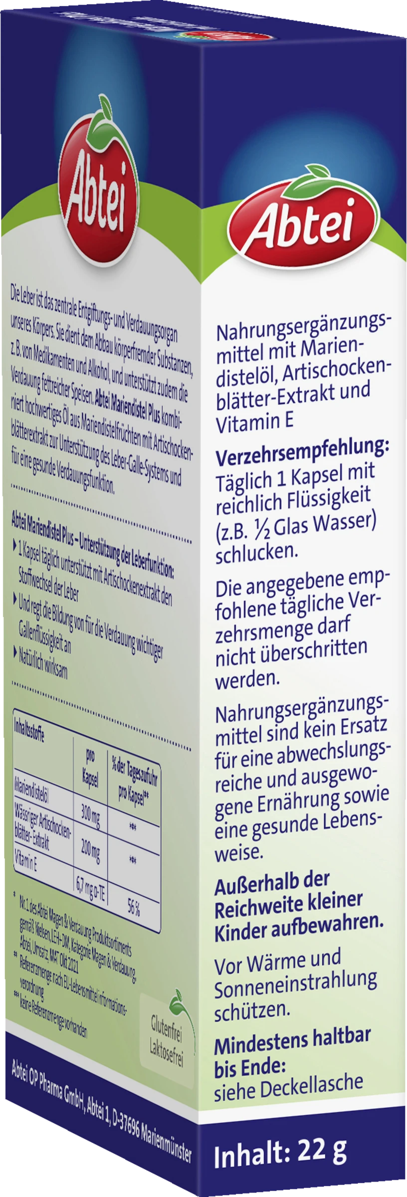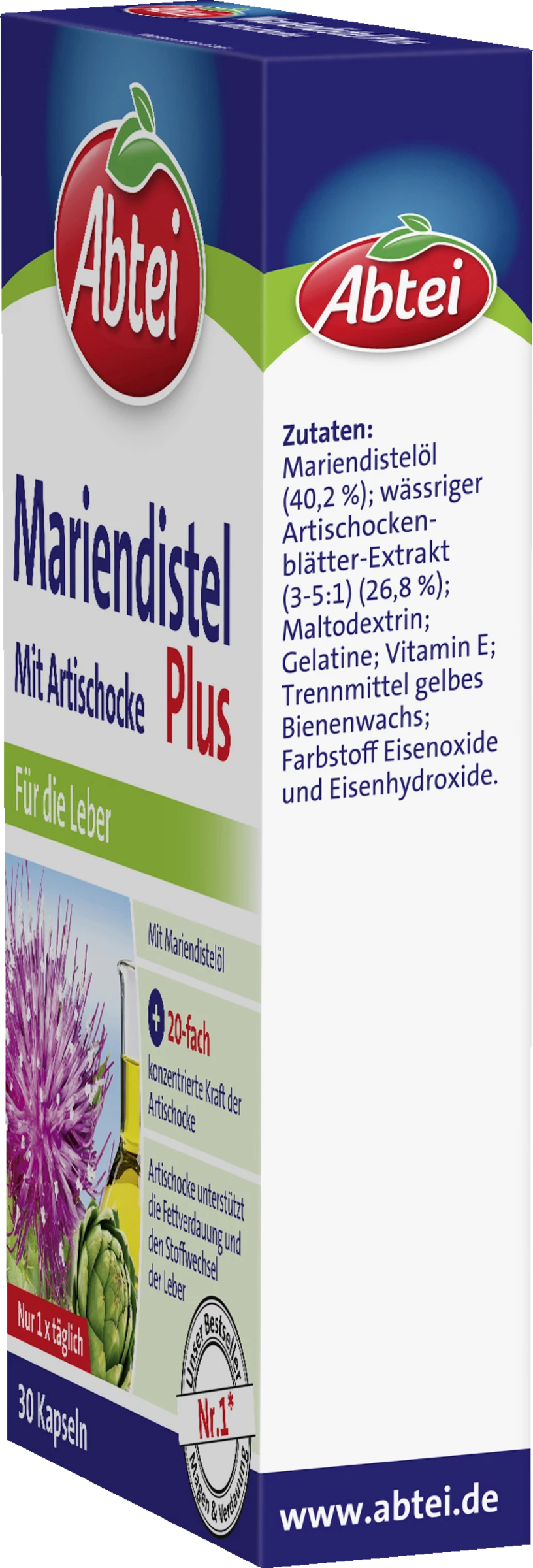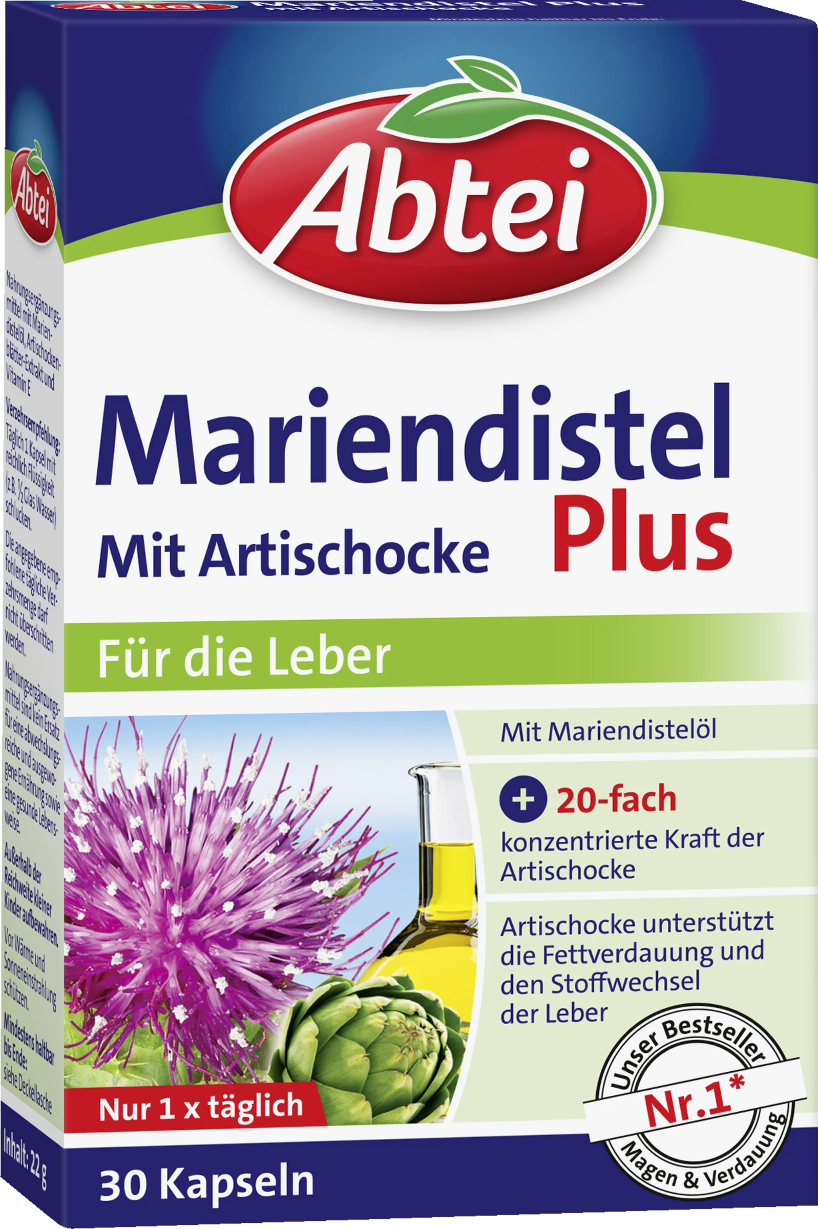 Unsere Leber ist ebenso unersetzlich wie vielseitig: Sie ist Stoffwechsel-Zentrale, Glykogen-Speicher und auch das Entgiftungs- und Verdauungsorgan unseres Körpers. Außerdem dient sie dem Abbau körperfremder und -schädlicher Substanzen, wie z.B. Medikamenten und Alkohol, und unterstützt zudem die Verdauung fettreicher Speisen. Abtei Mariendistel Plus kombiniert hochwertiges Mariendistelöl mit Artischockenblätterextrakt zur Unterstützung der Leberfunktion. Die Mariendistel-Kapseln enthalten die 20-fach konzentrierte Kraft der Artischocke. Eine Kapsel täglich unterstützt den Stoffwechsel der Leber und ist dabei natürlich wirksam.