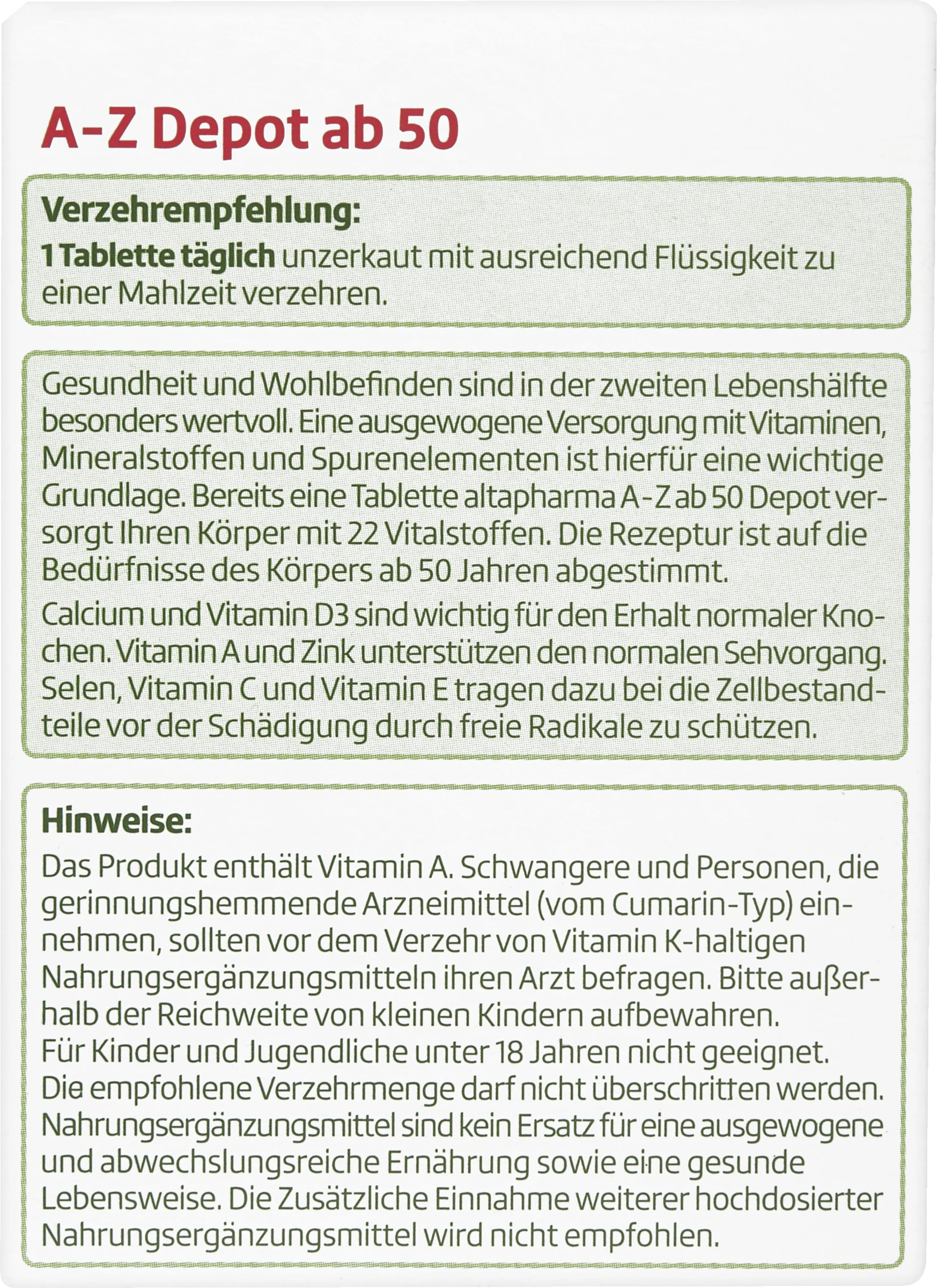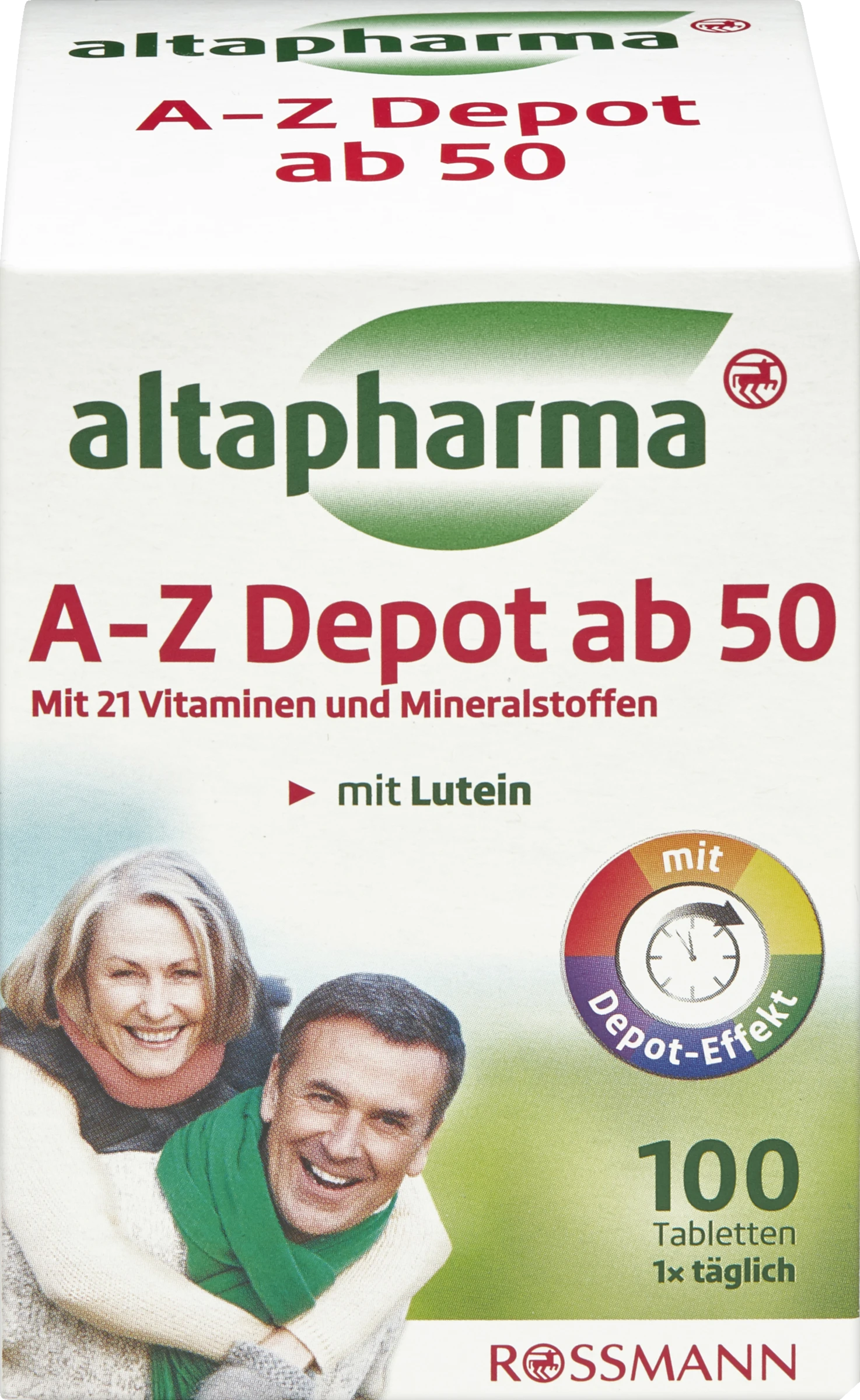 Gesundheit und Wohlbefinden sind in der zweiten Lebenshälfte besonders wertvoll. Eine ausgewogene Versorgung mit Vitaminen, Mineralstoffen und Spurenelementen ist hierfür eine wichtige Grundlage. Bereits eine Tablette altapharma A-Z ab 50 Depot versorgt Ihren Körper mit 22 Vitalstoffen. Die Rezeptur ist auf die Bedürfnisse des Körpers ab 50 Jahren abgestimmt.