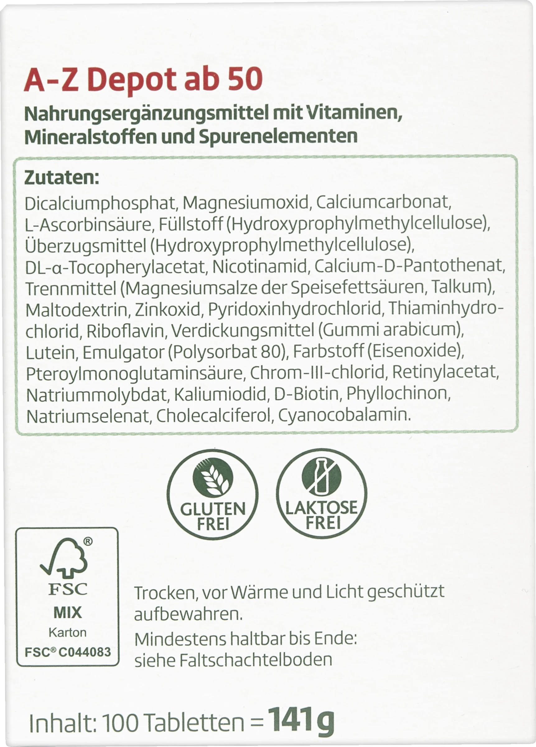 Dicalciumphosphat, Magnesiumoxid, Calciumcarbonat, L-Ascorbinsäure, Füllstoff (Hydroxyprophylmethylcellulose), Überzugsmittel (Hydroxypropymethylcellulose), DL-a-Tocopherylacetat, Nicotinamid, Calcium-D-Pantothenat, Trennmittel (Magnesiumsalze der Speisefettsäuren, Talkum), Maltodextrin, Zinkoxid, Pyridoxinhydrochlorid, Thiaminhydrochlorid, Riboflavin, Verdickungsmittel (Gummi arabicum), Lutein, Emulgator (Polysorbat 80), Farbstoffe (Eisenoxide), Pteroylmonoglutaminsäure, Chrom-(III)-Chlorid, Retinylacetat, Natriummolybdat, Kaliumiodid, D-Biotin, Phyllochinon, Natriumselenat, Cholecalciferol, Cyanocobalamin