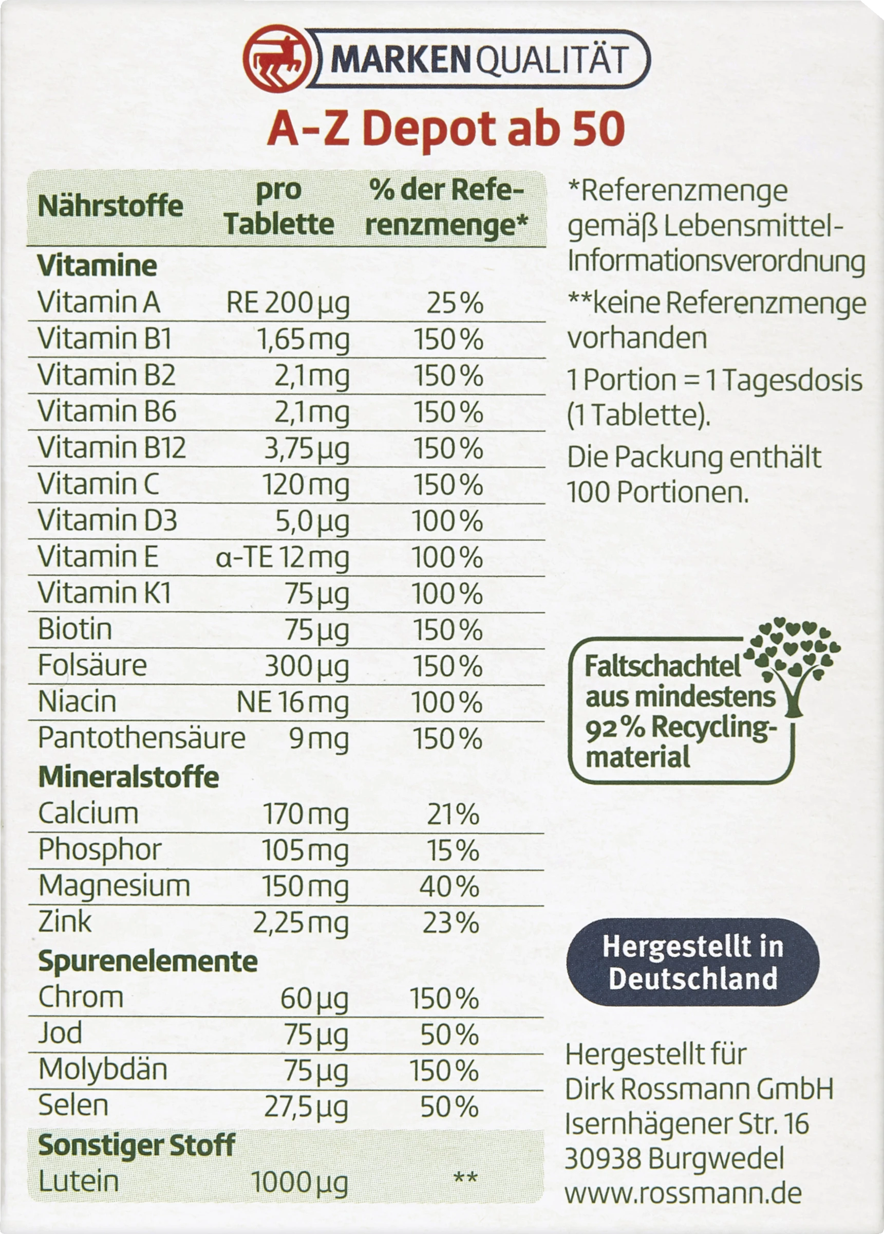 Verzehrempfehlung: 1 Tablette täglich unzerkaut mit ausreichend Flüssigkeit zu einer Mahlzeit verzehren.