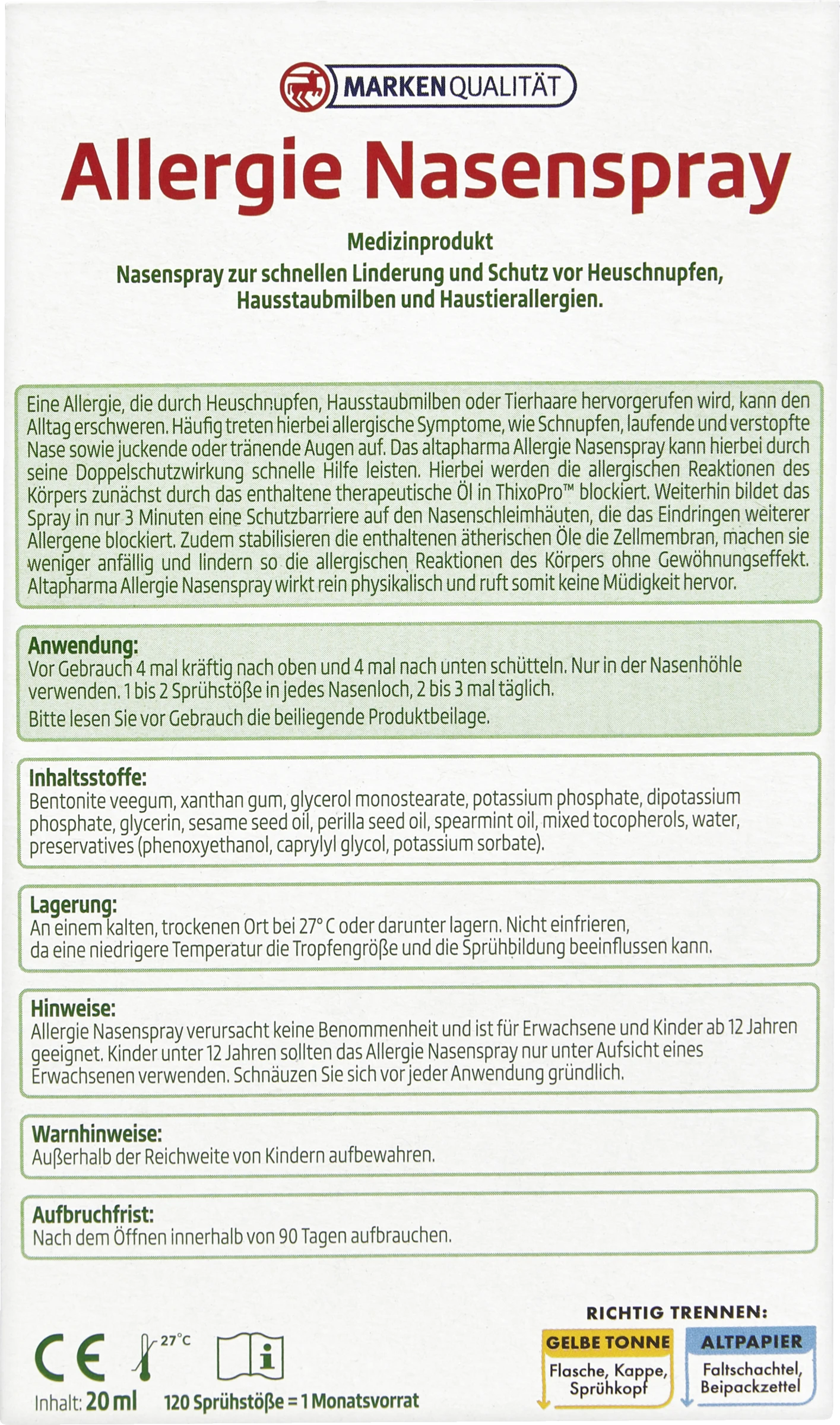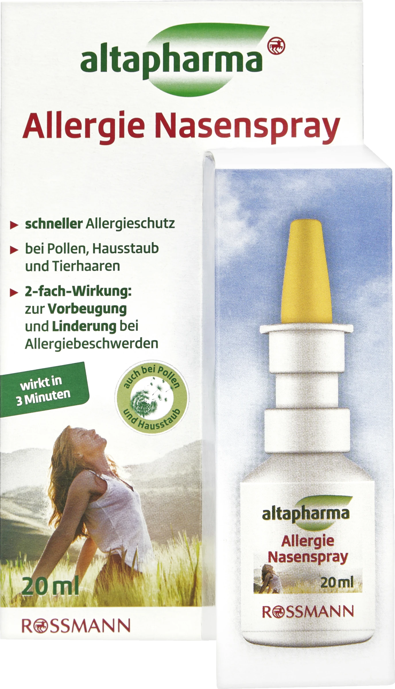 Eine Allergie, die durch Heuschnupfen, Hausstaubmilben oder Tierhaare hervorgerufen wird, kann den Alltag erschweren. Häufig treten hierbei allergische Symptome, wie Schnupfen, laufende und verstopfte Nase sowie juckende oder tränende Augen auf. Das altapharma Allergie Nasenspray kann hierbei durch seine Doppelschutzwirkung schnelle Hilfe leisten. Hierbei werden die allergischen Reaktionen des Körpers zunächst durch das enthaltene therapeutische Öl in ThixoPro™ blockiert. Weiterhin bildet das Spray in nur 3 Minuten eine Schutzbarriere auf den Nasenschleimhäuten, die das Eindringen weiterer Allergene blockiert. Zudem stabilisieren die enthaltenen ätherischen Öle die Zellmembran, machen sie weniger anfällig und lindern so die allergischen Reaktionen des Körpers ohne Gewöhnungseffekt. Altapharma Allergie Nasenspray wirkt rein physikalisch und ruft somit keine Müdigkeit hervor.