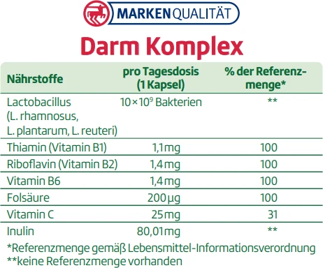 Eine gesunde Darmflora ist ausgesprochen wichtig für ein intaktes Immunsystem. Altapharma Darm Komplex enthält 10 Mrd. Milchsäurebakterien in Verbindung mit relevanten Nährstoffen. Das in altapharma Darm Komplex enthaltene Vitamin B2 trägt zur Erhaltung normaler Schleimhäute bei. Damit auch derer des Darms. Vitamin B6, C und Folsäure leisten zudem einen Beitrag zur normalen Funktion des Immunsystems.