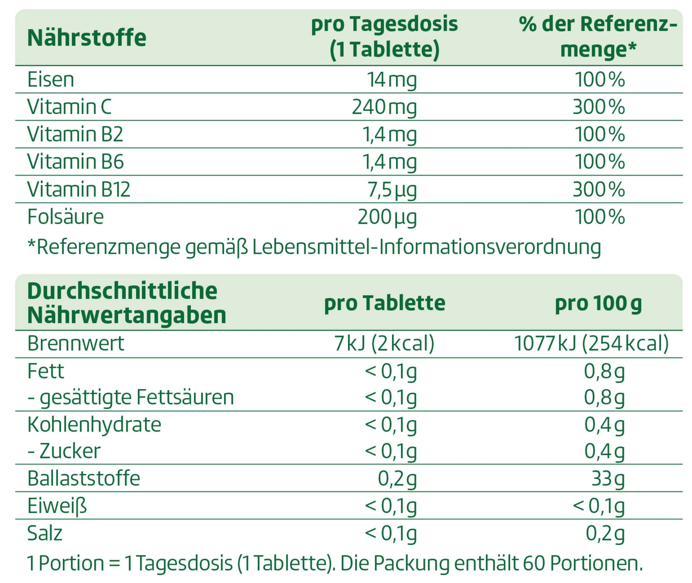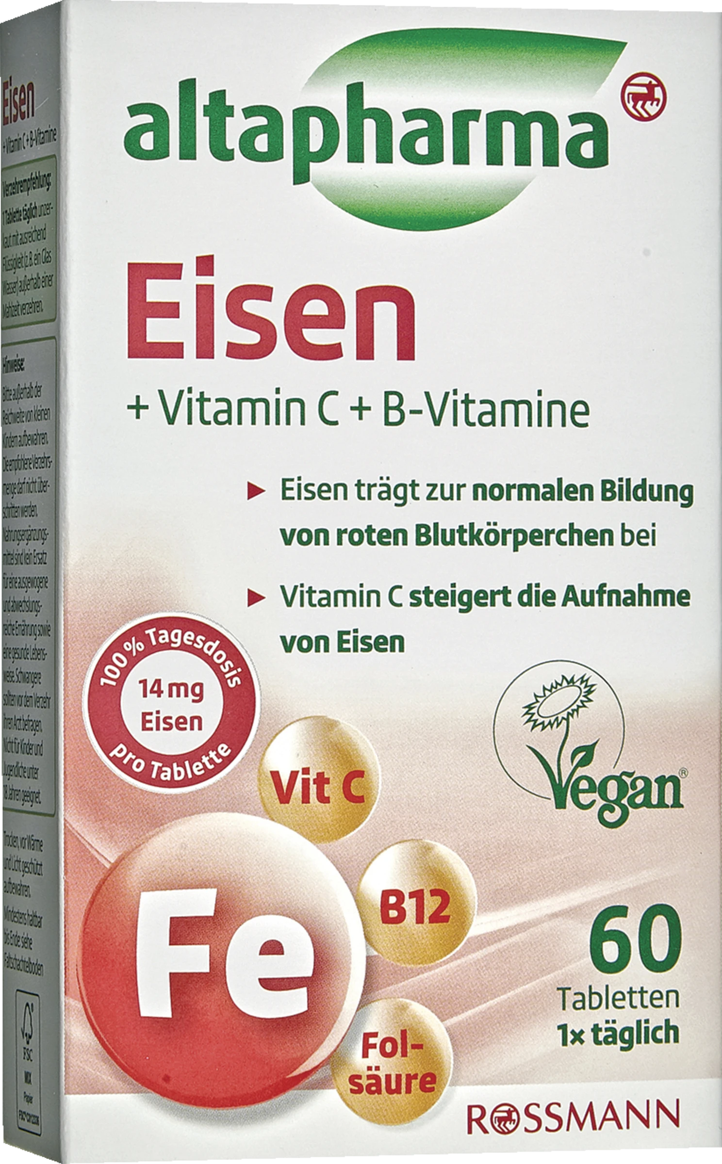 Sportler, Schwangere, stillende Mütter und Senioren können einen erhöhten Eisenbedarf haben. Vegetarier und Personen mit einer unausgewogenen Lebensmittelauswahl nehmen mitunter nicht genügend Eisen mit der Nahrung zu sich. Altapharma Eisentabletten enthalten neben Eisen auch Vitamin C und Vitamine des B-Komplexes, die im Eisen- und Blutstoffwechsel von Bedeutung sind. Eisen ist an der normalen Bildung des roten Blutfarbstoffs beteiligt und bewirkt so den normalen Sauerstofftransport im Blut. So kann Eisen auch zur Verringerung von Müdigkeit und Ermüdung beitragen. Weiterhin hat es eine Funktion bei der Zellteilung. Vitamin C steigert die Eisenaufnahme. Die Vitamine B6, B12 und Folsäure tragen zur normalen Bildung roter Blutkörperchen bei. Vitamin B2 unterstützt zudem den normalen Eisen-Stoffwechsel und trägt zusammen mit Eisen, den Vitaminen B6, B12 und C zu einer Verringerung von Müdigkeit und Ermüdung bei und unterstützt so die Leistungsfähigkeit.