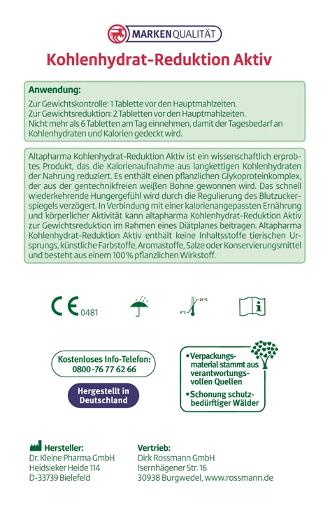 Nicht empfohlen für Kinder und Jugendliche. Verwenden Sie dieses Produkt nicht während der Schwangerschaft oder der Stillzeit. Nicht bei Untergewicht (BMI unter 18,5) anwenden. Durch die Einnahme von altapharma Kohlenhydrat-Reduktion Aktiv wird ein Teil der Kohlenhydrate unverdaut ausgeschieden; dass kann zu Blähungen führen.