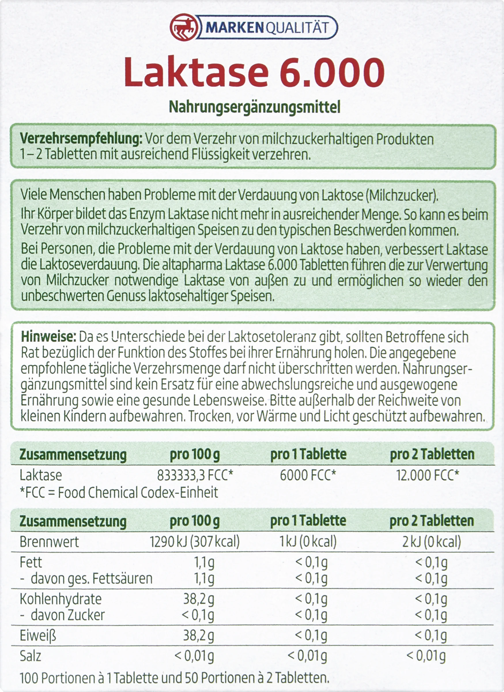 Verzehrempfehlung: Vor dem Verzehr von milchzuckerhaltigen Produkten 1-2 Tabletten mit ausreichend Flüssigkeit verzehren
