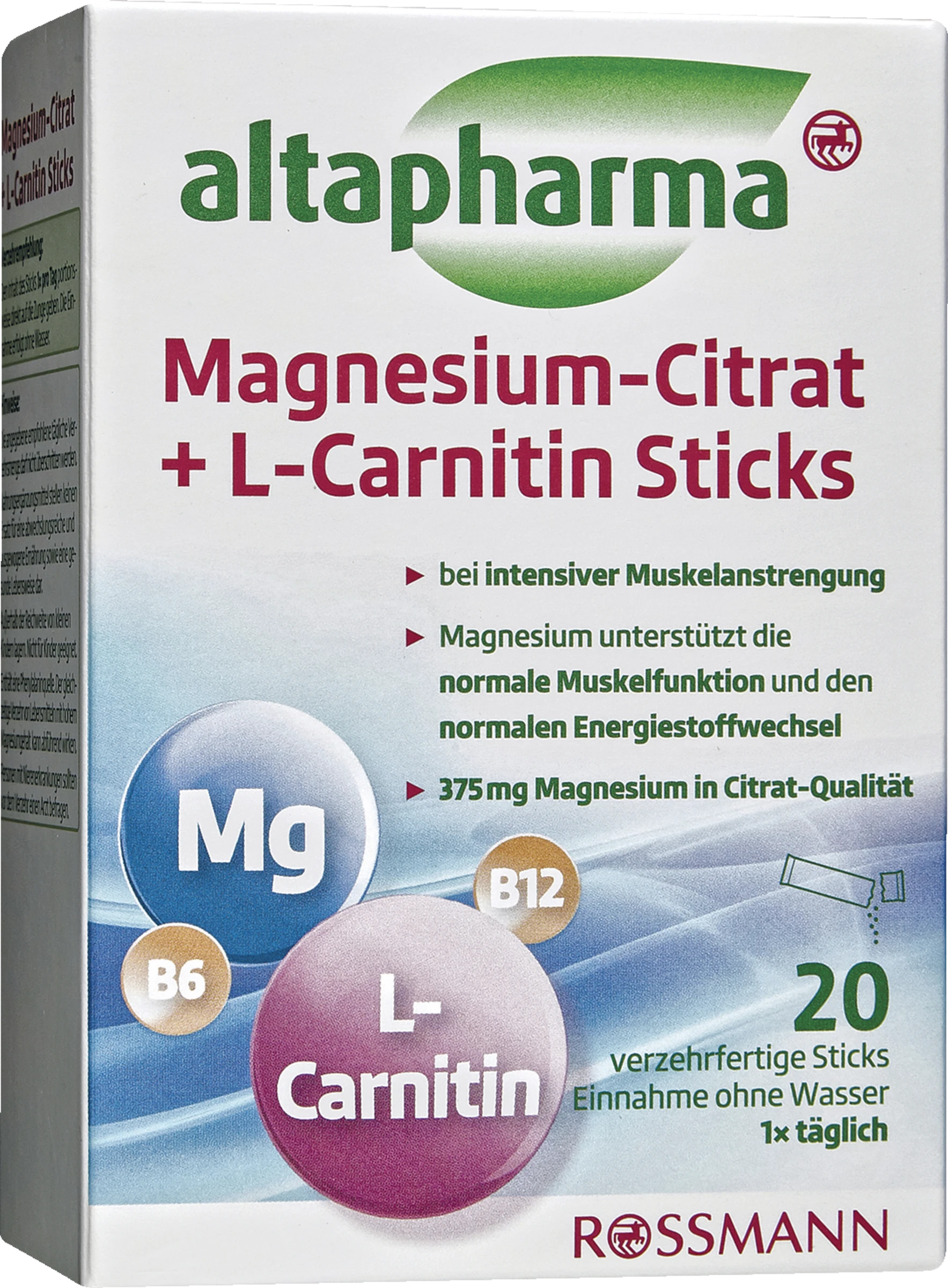 Magnesium ist ein essentieller Mineralstoff, der die normale Muskelfunktion sowie die normale Funktion des Nervensystems unterstützt. Zudem trägt er zum Elektrolythaushalt bei. Insbesondere bei hoher körperlicher Aktivität, wie z.B. Sport, ist eine zusätzliche Versorgung mit Magnesium empfehlenswert. L-Carnitin wird im Körper selbst gebildet und ist ein natürlicher Baustein im Energiestoffwechsel. L-Carnitin transportiert Fettsäuren in die Mitochondrien, die „Brennöfen“ der Zellen, wo aus den Fettsäuren Energie gewonnen werden kann. Vitamin B6 unterstützt die normale Funktion des Nervensystems, trägt zu einem normalen Energiestoffwechsel bei und leistet einen Beitrag zur Verringerung von Müdigkeit und Ermüdung bei. Vitamin B12 trägt zusätzlich zur normalen psychischen Funktion und gesundem Immunsystem bei. Das Produkt enthält Magnesium-Citrat als Magnesiumquelle. MagnesiumCitrat ist das Magnesiumsalz der Zitronensäure und stellt eine körperfreundliche Form des Magnesiums dar, da es in gleicher Form direkt im Körper vorkommt. Altapharma Magnesium-Citrat + L-Carnitin Sticks sind ideal für unterwegs.