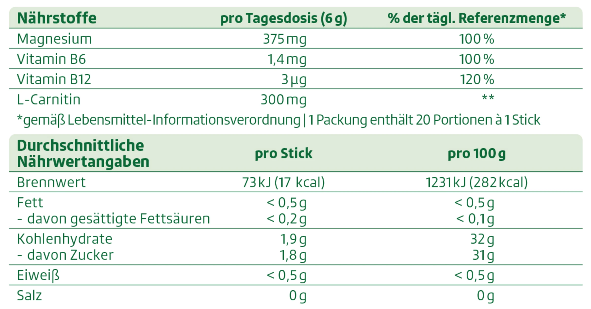Nahrungsergänzungsmittel mit Magnesium, L-Carnitin und den Vitaminen B6 und B12. Mit Zucker und Süßungsmitteln.