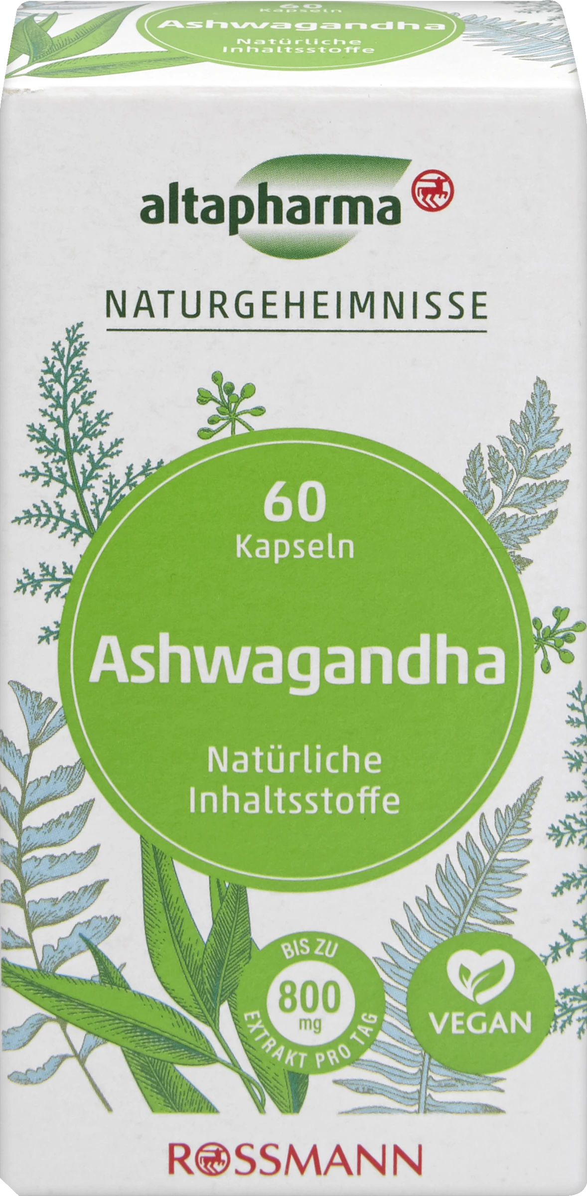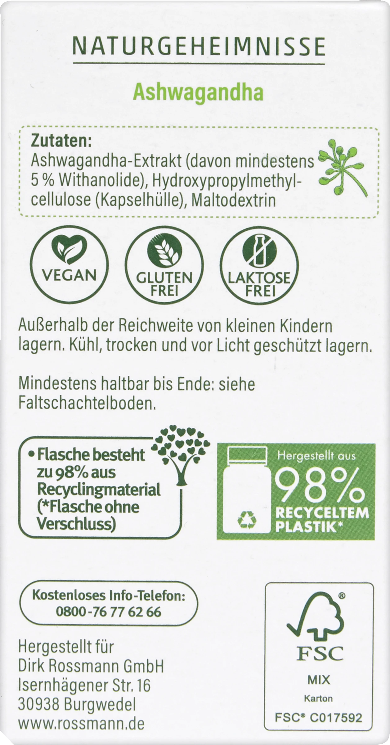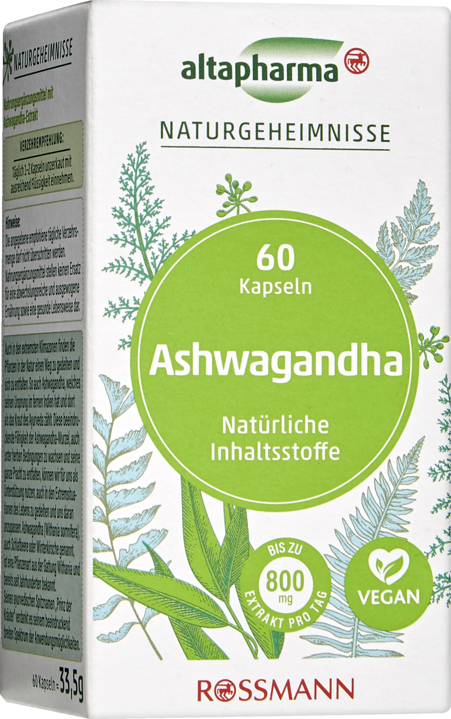 Ashwagandha-Extrakt (davon mindestens 5% Withanolide), Hydroxypropylmethylcellulose (Kapselhülle), Maltodextrin.