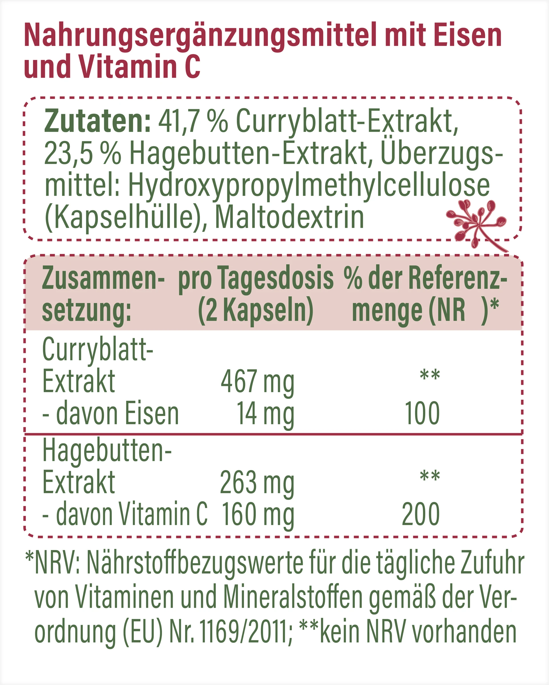 Das Curryblatt gilt wegen seines hohen Eisengehaltes als eine interessante pflanzliche Alternative zu anderen Eisenpräparaten. Die pflanzlichen Eisenkapseln aus Curryblättern werden vom Verbraucher gut angenommen und das Eisen wird vom Körper durch die Kombination mit natürlichem Vitamin C aus der Hagebutte, welches die Eisenaufnahme fördert, noch besser aufgenommen. In bestimmten Lebensabschnitten wird empfohlen Eisen extra zu supplementieren. Da der Mensch Eisen aus tierischen Lebensmitteln (Hämeisen) sehr viel besser verwerten kann als aus Obst und Gemüse (Nicht-Hämeisen), kann z.B. eine zusätzliche Supplementierung gerade für Veganer und Vegetarier sinnvoll sein. Eisen trägt zur normalen Bildung von roten Blutkörperchen und Hämoglobin sowie zu einem normalen Sauerstofftransport im Körper bei. Zudem kann Eisen zu einer gesunden kognitiven Funktion beitragen und mit dem Vitamin C das normale Immunsystem unterstützen und einen Beitrag zur Verringerung von Müdigkeit und Ermüdung leisten. Des Weiteren erhöht Vitamin C die Eisenaufnahme und kann helfen die Zellen vor oxidativem Stress zu schützen.