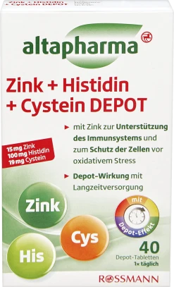 Stress, starke körperliche Belastung, eine unausgewogene Ernährung oder andere externe Faktoren wie Kälte und Nässe können unser Immunsystem und unsere Haut, Haare und Nägel beanspruchen. Gerade dann ist eine zusätzliche Versorgung des Körpers mit ausgewählten Nährstoffen sinnvoll. Altapharma Zink + Histidin + Cystein Depot unterstützt mit Zink die normale Funktion des Immunsystems und trägt zum Schutz der Zellen vor oxidativem Stress bei. Darüber hinaus leistet es einen Beitrag zum Erhalt normaler Haut, Haare und Nägel. Die Rezeptur ist sinnvoll ergänzt um die Aminosäuren Histidin und Cystein. Durch die Depot-Funktion werden die enthaltenen Nährstoffe zeitverzögert freigesetzt, wodurch eine Versorgung des Körpers über mehrere Stunden gewährleistet wird.