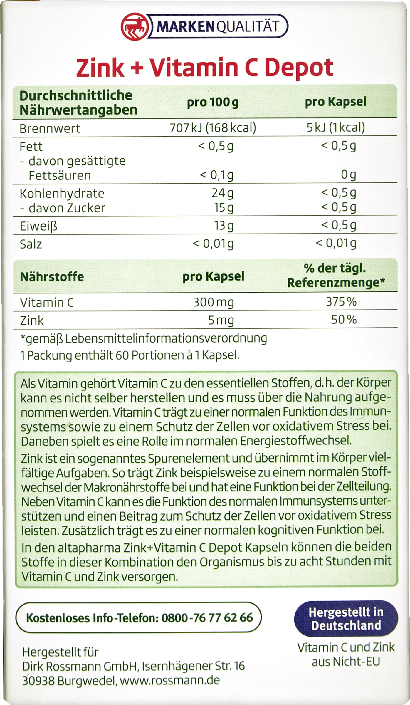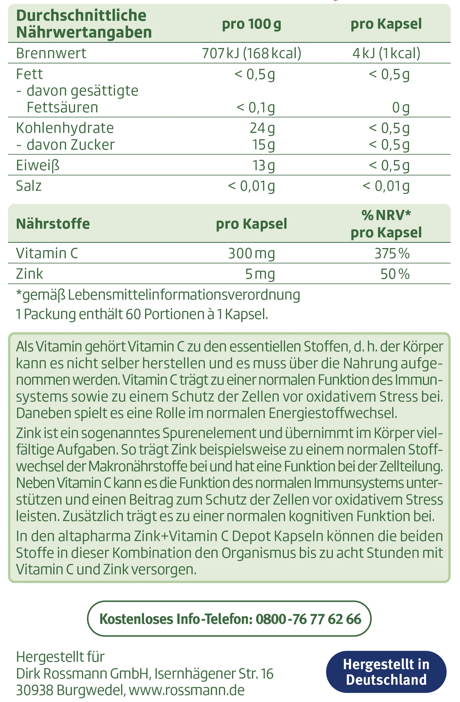 In den altapharma Zink + Vitamin C Depot Kapseln können die beiden Stoffe in dieser Kombination den Organismus bis zu acht Stunden mit Vitamin C und Zink versorgen.