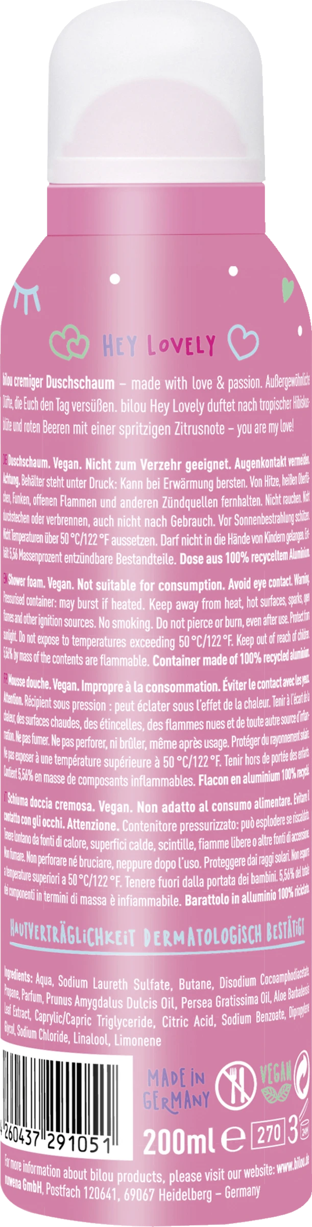bilou?Hey Lovely?duftet nach?tropischer? Hibiskusblüte und?roten?Beeren mit?einer spritzigen Zitrusnote?–?you are my love! Wir sind auch hier unserer Philosophie treu geblieben und daher ist bilou wie gewohnt zu 100% vegan. Aloe Vera, Mandel- sowie Avocadoöl sorgen für eine sanfte Pflege, die Hautverträglichkeit wurde bestätigt. Die Aerosoldose sorgt dafür, dass der Duschschaum nicht nur richtig lange haltbar, sondern auch super einfach zu dosieren ist! Und das Beste – die bilou Dose besteht aus 100% recyceltem Aluminium und ist zu 100% recycelbar. Hautverträglichkeit dermatologisch bestätigt.