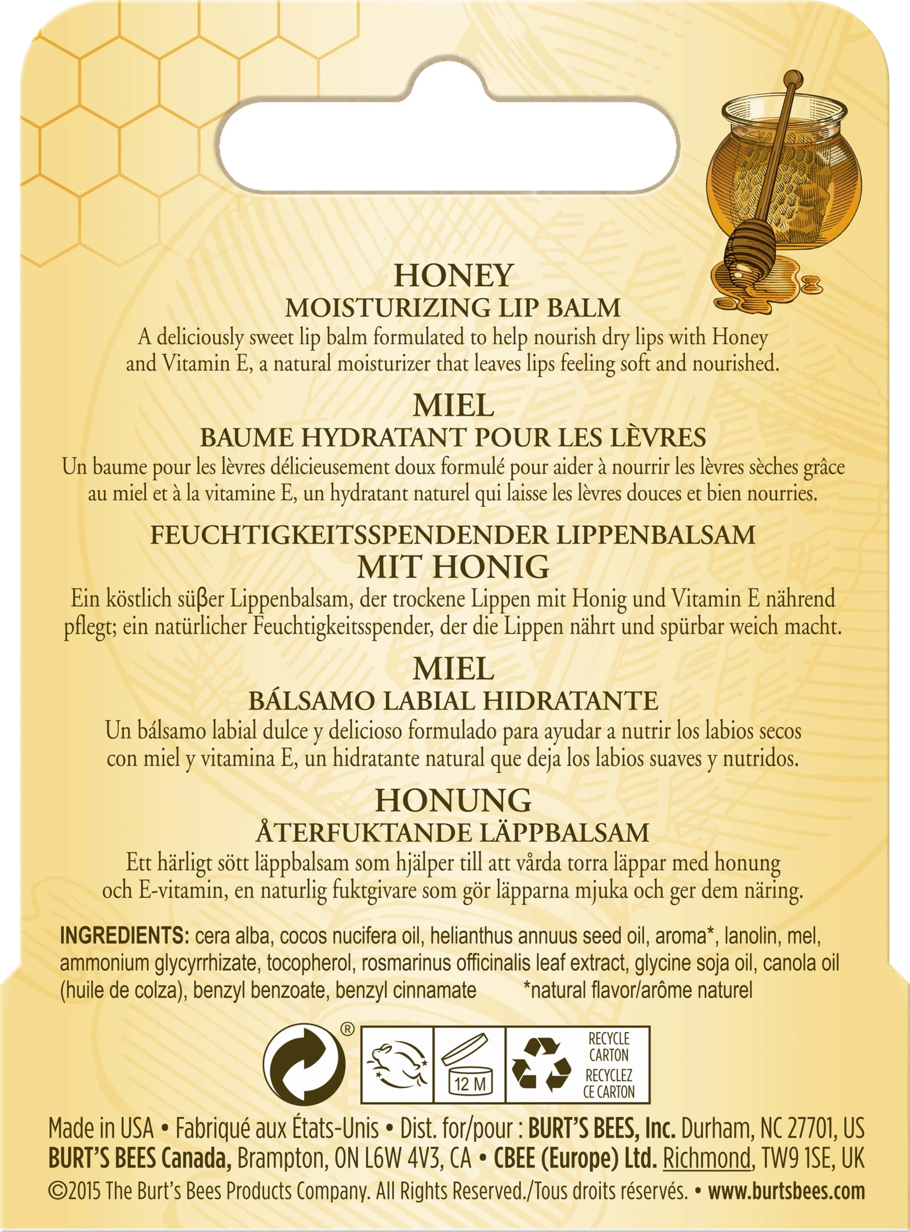 Cera alba, Cocos nucifera Öl, Helianthus annuus Samenöl, Aroma*, Lanolin, Mel, Ammoniumglycyrrhizat, Tocopherol, Rosmarinus officinalis Blätterextrakt, Glycine soja Öl, Rapsöl (Huile de Colza), Benzylbenzoat, Benzylcinnamat.