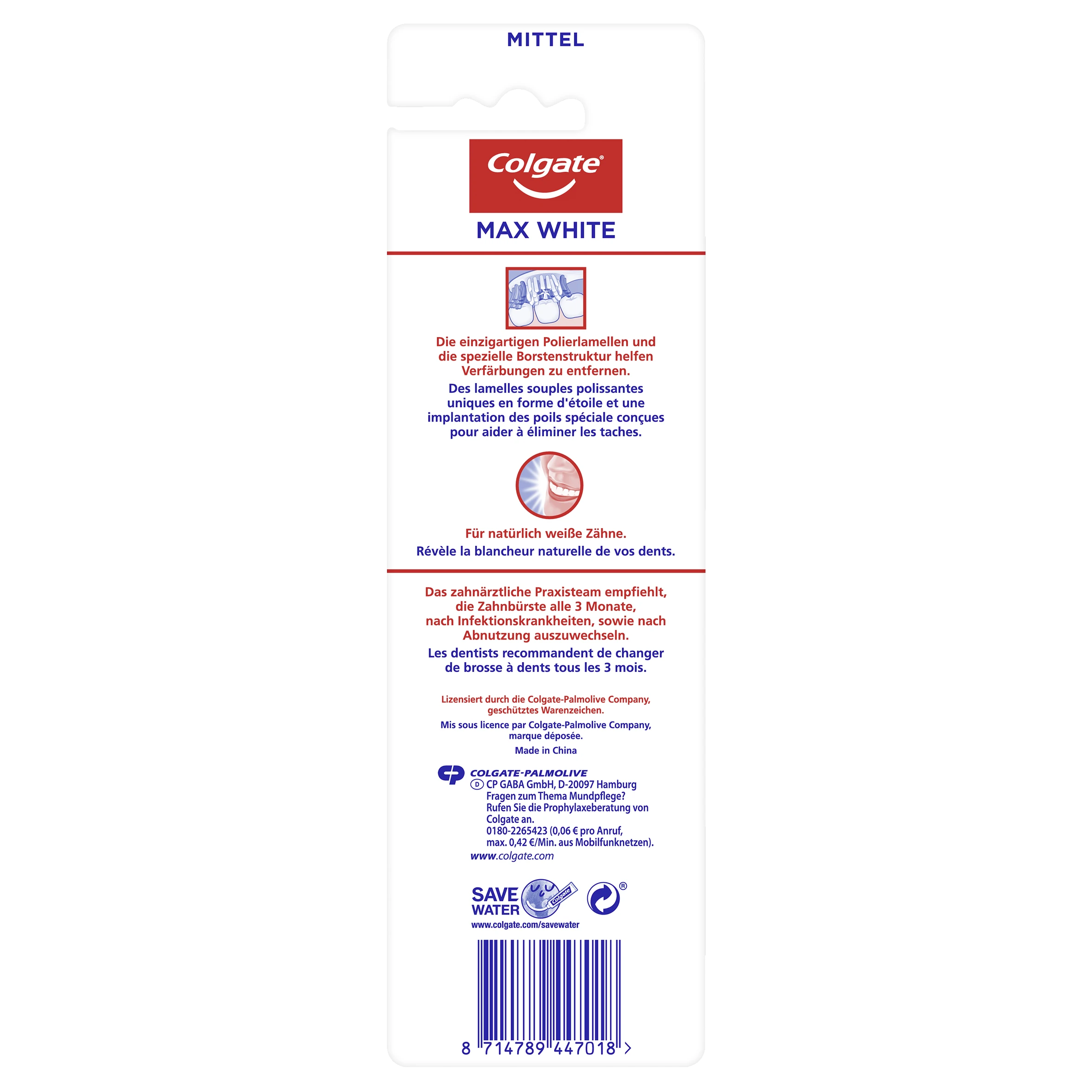 Die Colgate Max White Zahnbürste sorgt für einen rundum gereinigten Mund plus weißere Zähne. Die einzigartigen Polierlamellen und die spezielle Borstenstruktur helfen Verfärbungen zu entfernen.Für natürlich weiße Zähne.