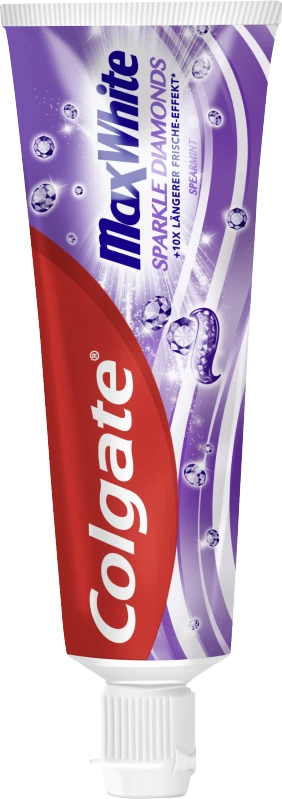 Zeigen Sie ein strahlendes, weißes Lächeln mit der Colgate Max White Sparkle Diamonds Zahnpasta. Unsere Sparkle Diamonds Formel poliert die Zahnoberflächen und glättet dabei den Zahnschmelz der Zähne – für glattere und weißere Zähne. Die FreshFX-Technologie sorgt für einen Frische-Effekt, der 10x länger anhält im Vergleich zu herkömmlicher Fluoridzahnpasta.