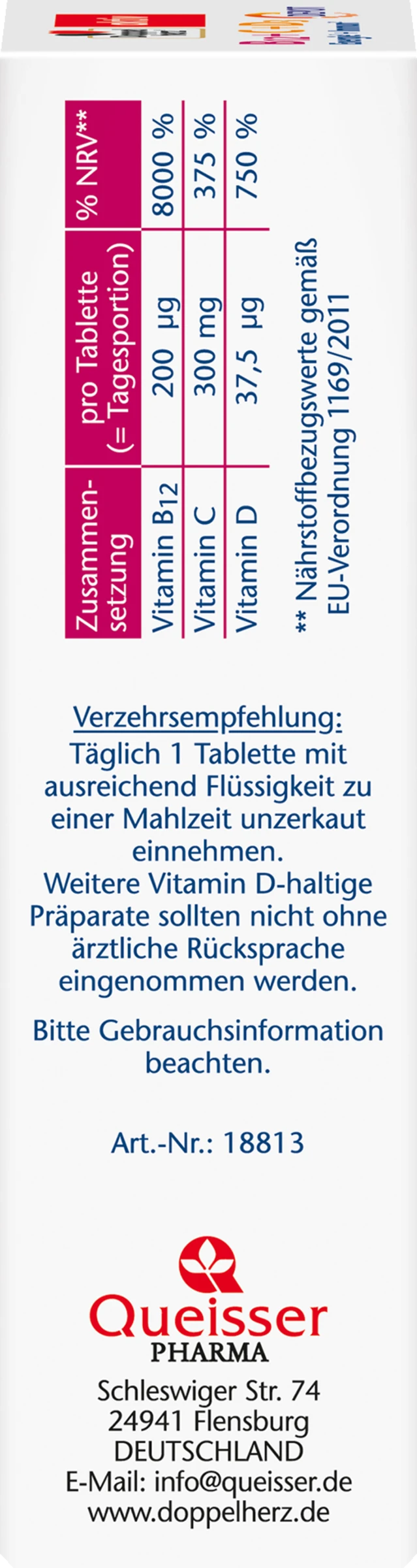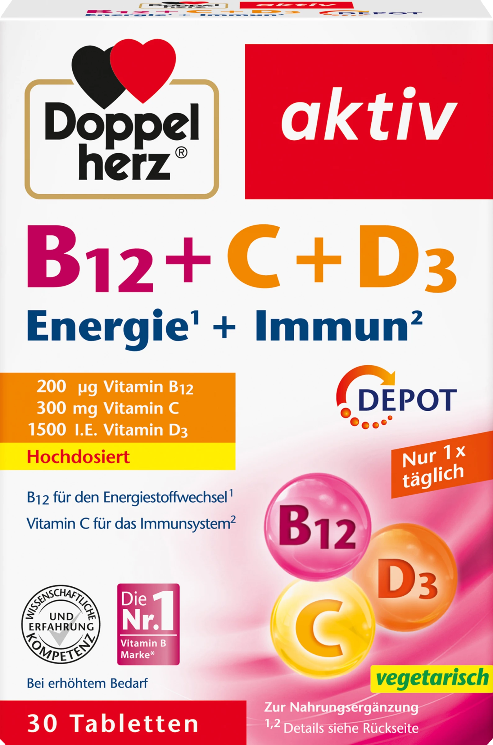 Für die Gesundheit spielt eine ausreichende Versorgung mit Nährstoffen eine wichtige Rolle. Der Körper kann Vitamin B12 nicht selbst bilden, weshalb es über die Nahrung aufgenommen werden muss. Bestimmte Vitamine kann der Körper nicht lange speichern. Werden z. B. große Mengen an Vitamin C mit einem Mal aufgenommen, scheidet der Körper einen Teil ungenutzt wieder aus. Vitamin D kann unser Körper durch die regelmäßige Einwirkung von Sonnenlicht auf die Haut selbst bilden. Diese Eigenproduktion reicht in unseren Breitengraden jedoch in Abhängigkeit von der Jahreszeit und den Lebensumständen häufig nicht aus. Doppelherz Vitamin B12 + C + D3 DEPOT enthält Vitamin B12 für den Energiestoffwechsel in Kombination mit Vitamin C und Vitamin D zur Unterstützung der normalen Funktion des Immunsystems. So kann eine gute Vitaminversorgung bei erhöhtem Bedarf, einer unausgewogenen Ernährung oder bei nachlassender Vitamin B12-Verwertung im Alter unterstützt werden.