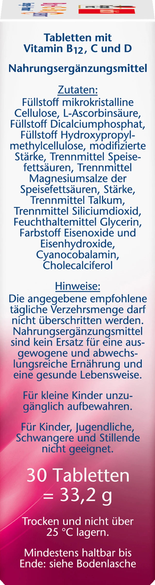 Füllstoff mikrokristalline Cellulose, L-Ascorbinsäure, Füllstoff Dicalciumphosphat, Füllstoff Hydroxypropylmethylcellulose, modifizierte Stärke, Trennmittel Speisefettsäuren, Trennmittel Magnesiumsalze der Speisefettsäuren, Stärke, Trennmittel Talkum, Trennmittel Siliciumdioxid, Feuchthaltemittel Glycerin, Farbstoff Eisenoxide und Eisenhydroxide, Cyanocobalamin, Cholecalciferol.