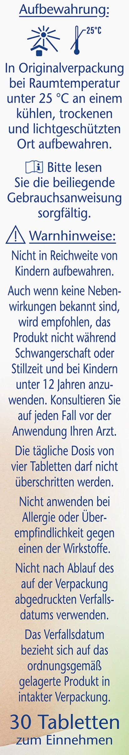 Auch wenn keine Nebenwirkungen bekannt sind, wird empfohlen, das Produkt nicht während der Schwangerschaft oder Stillzeit und bei Kindern unter 12 Jahren anzuwenden. Konsultieren Sie auf jeden Fall vor der Anwendung Ihren Arzt. Die tägliche Dosis von vier Tabletten darf nicht überschritten werden. Nicht anwenden bei Allergie oder Überempfindlichkeit gegen einen der Wirkstoffe. Nicht nach Ablauf des auf der Verpackung abgedruckten Verfallsdatums verwenden. Das Verfallsdatum bezieht sich auf das ordnungsgemäß gelagerte Produkt in intakter Verpackung.