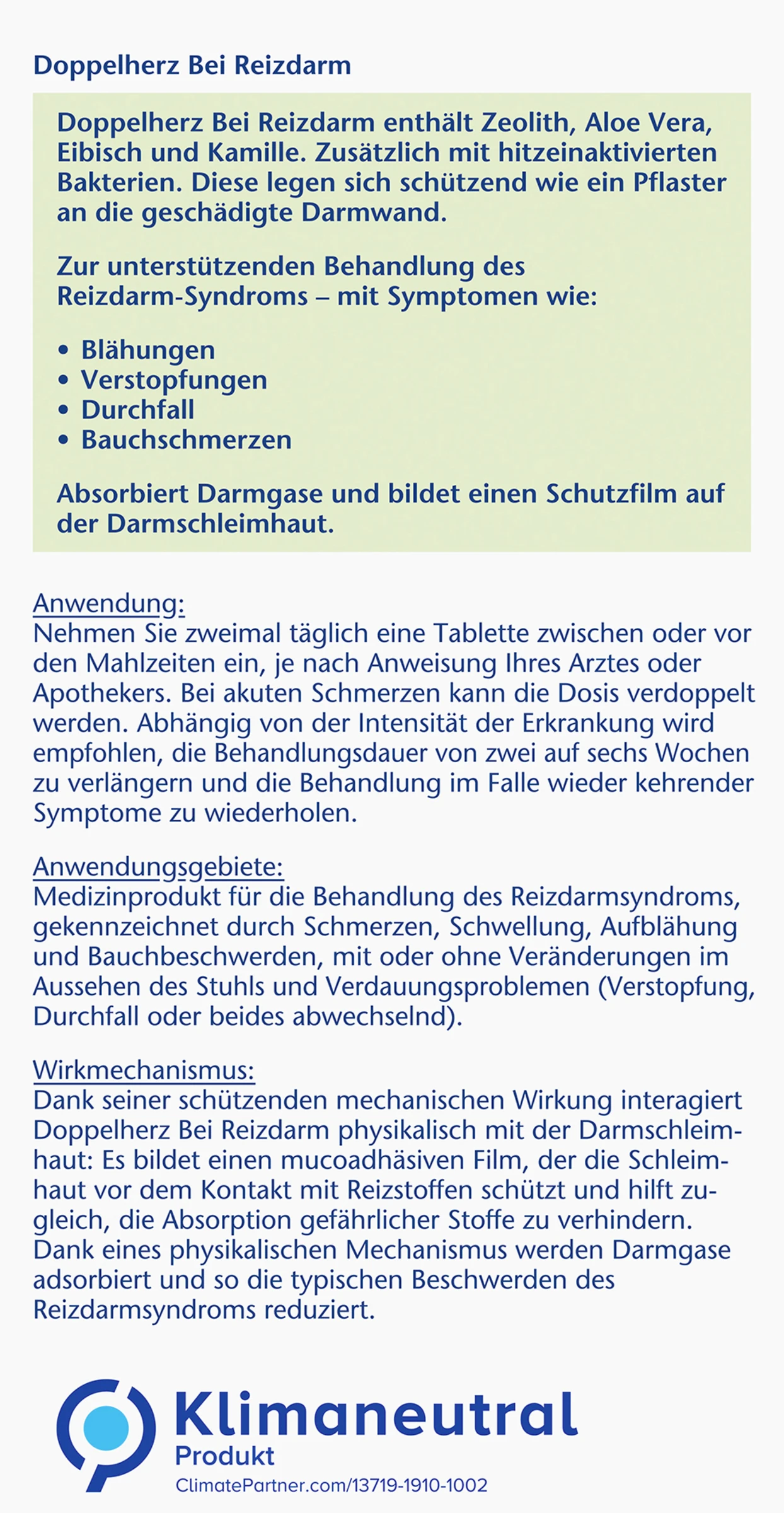 Das Medizinprodukt Doppelherz Bei Reizdarm enthält das Mineral Zeolith in Kombination mit Kamillen- und Eibischextrakt sowie Aloe Vera und wird zur unterstützenden Behandlung des Reizdarm-Syndroms mit folgenden Symptomen angewendet: Blähungen, Verstopfungen, Durchfall und Bauchschmerzen.Zusätzlich sind hitzeinaktivierte Bakterien enthalten. Diese legen sich wie ein Pflaster an die geschädigte Darmwand.
