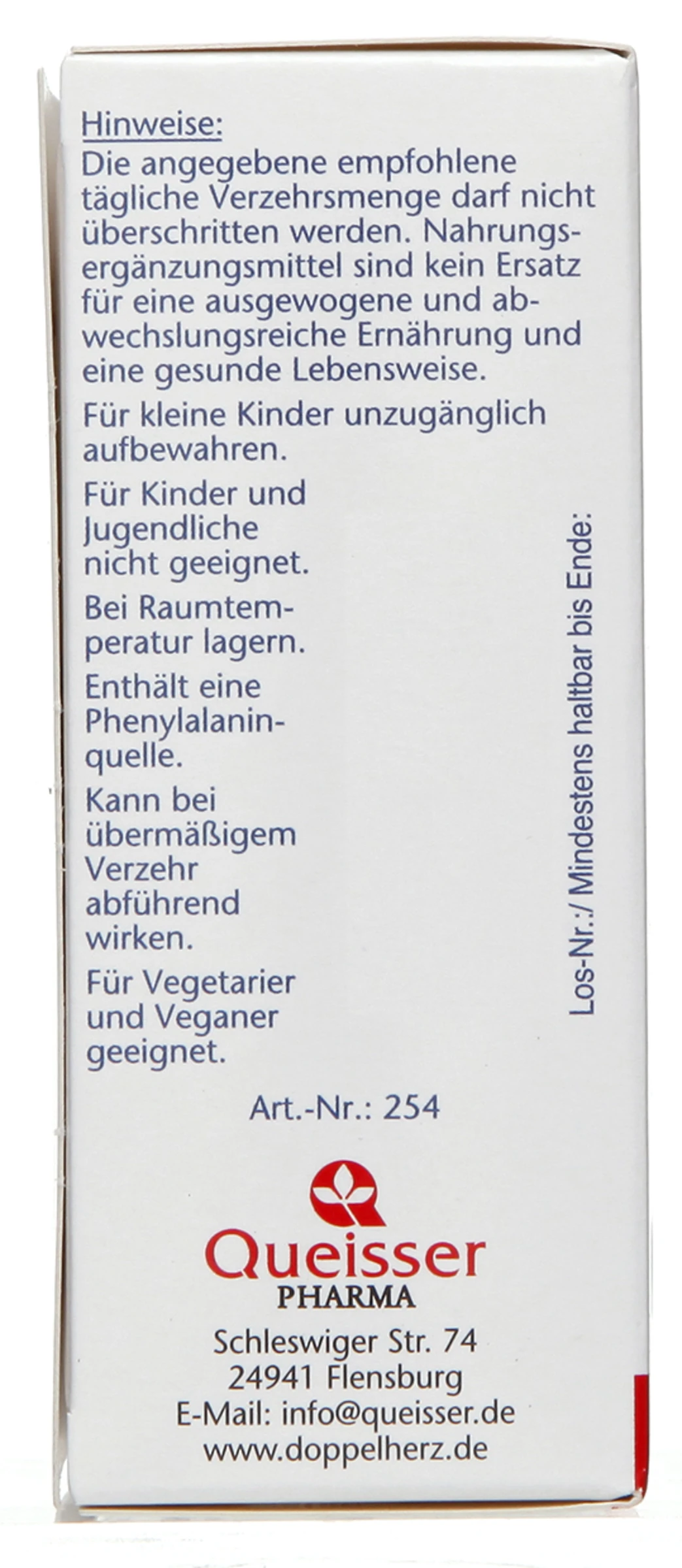 Die angegebene empfohlene tägliche Verzehrsmenge darf nicht überschritten werden. Nahrungsergänzungsmittel sind kein Ersatz für eine ausgewogene und abwechslungsreiche Ernährung und eine gesunde Lebensweise. Für kleine Kinder unzugänglich aufbewahren. Enthält eine Phenylalaninquelle. Kann bei übermäßigem Verzehr abführend wirken. Für Kinder und Jugendliche nicht geeignet.