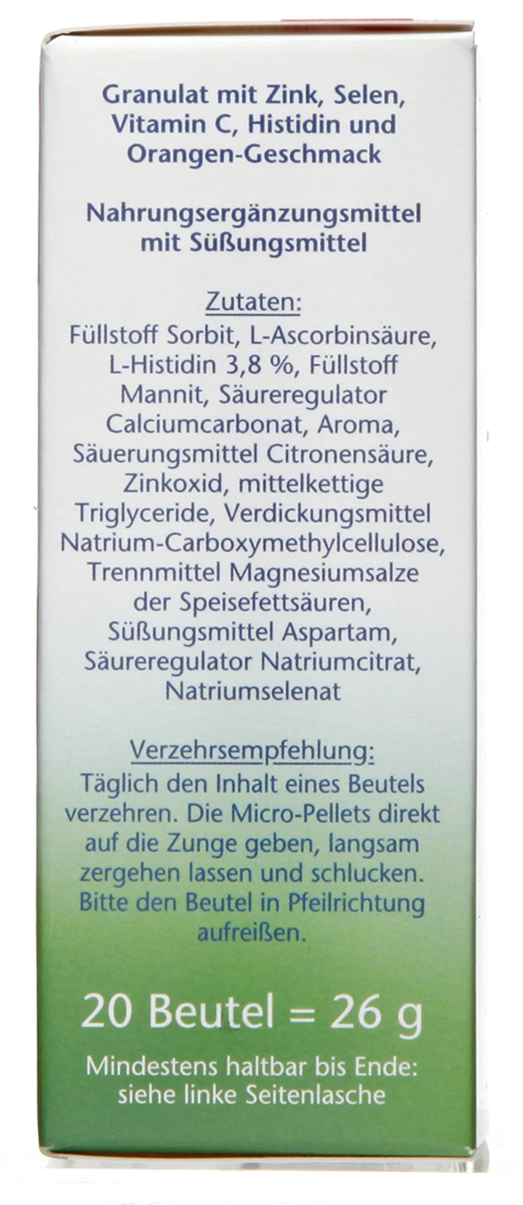 Füllstoff Sorbit, L-Ascorbinsäure, L-Histidin 3,8 %, Füllstoff Mannit, Säureregulator Calciumcarbonat, Aroma, Säuerungsmittel Citronensäure, Zinkoxid, mittelkettige Triglyceride, Verdickungsmittel Natrium-Carboxymethylcellulose, Trennmittel Magnesiumsalze der Speisefettsäuren, Süßungsmittel Aspartam, Säureregulator Natriumcitrat, Natriumselenat