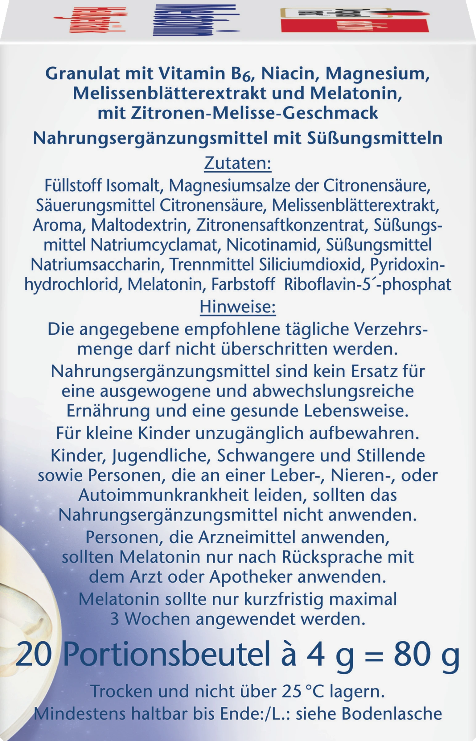 Granulat mit Vitamin B6, Niacin, Magnesium, Melissenblätterextrakt und Melatonin, mit Zitronen-Melisse-Geschmack. Nahrungsergänzungsmittel mit Süßungsmitteln