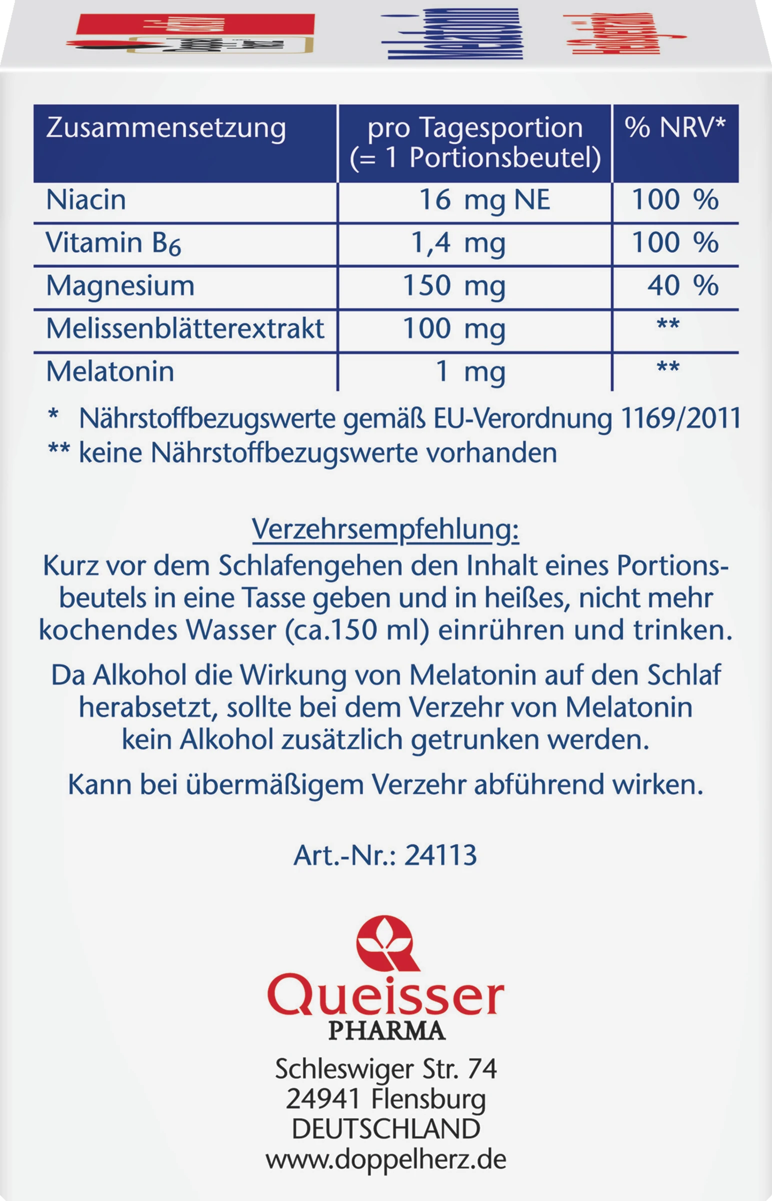 Kurz vor dem Schlafengehen den Inhalt eines Portionsbeutels in eine Tasse geben und in heißes, nicht mehr kochendes Wasser (ca. 150 ml) einrühren und trinken. Melatonin sollte nur kurzfristig maximal 3 Wochen angewendet werden.
