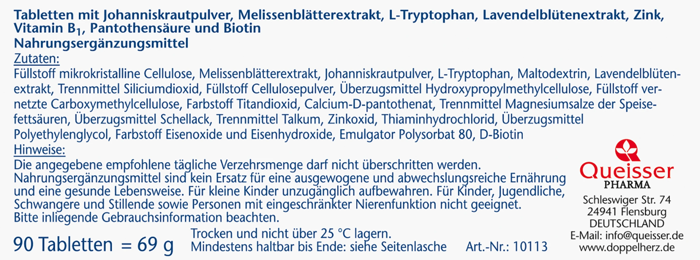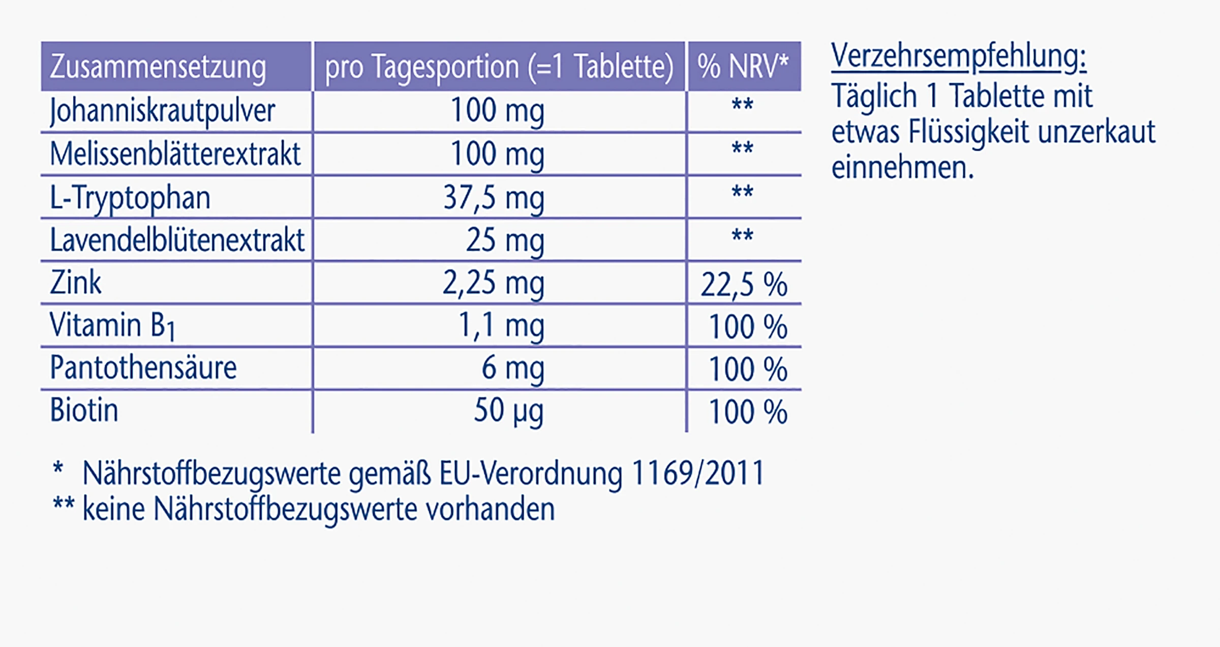 Füllstoff mikrokristalline Cellulose, Melissenblätterextrakt, Johanniskrautpulver, L-Tryptophan, Maltodextrin, Lavendelblütenextrakt, Trennmittel Siliciumdioxid, Füllstoff Cellulosepulver, Überzugsmittel Hydroxypropylmethylcellulose, Füllstoff vernetzte Carboxymethylcellulose, Farbstoff Titandioxid, Calcium-D-pantothenat, Trennmittel Magnesiumsalze der Speisefettsäuren, Überzugsmittel Schellack, Trennmittel Talkum, Zinkoxid, Thiaminhydrochlorid, Überzugsmittel Polyethylenglycol, Farbstoff Eisenoxide und Eisenhydroxide, Emulgator Polysorbat 80, D-Biotin.