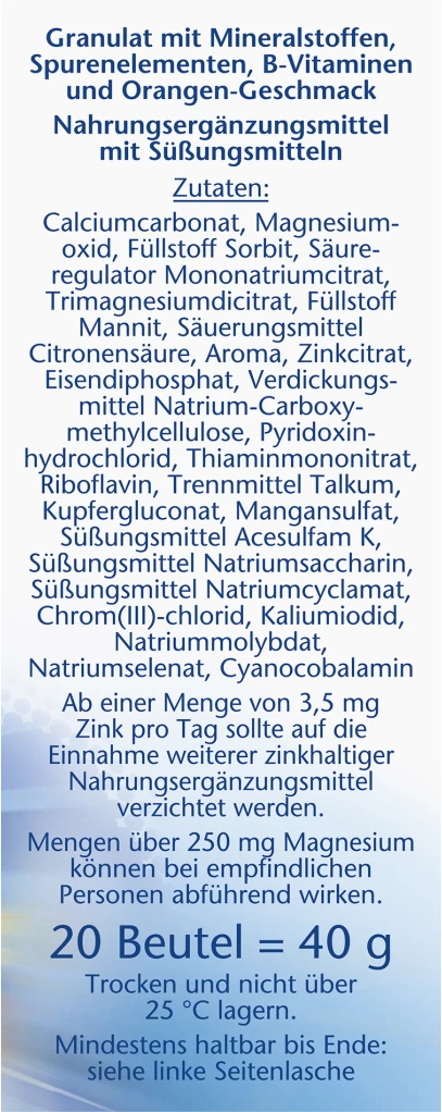 Calciumcarbonat, Magnesiumoxid, Füllstoff Sorbit, Säureregulator Mononatriumcitrat, Magnesiumcitrat, Füllstoff Mannit, Säuerungsmittel Citronensäure, Aroma, Zinkcitrat, Eisendiphosphat, Verdickungsmittel Natrium-Carboxymethylcellulose, Pyridoxinhydrochlorid, Riboflavin, Thiaminmononitrat, Trennmittel Talkum, Mangansulfat, Süßungsmittel Acesulfam K, Süßungsmittel Natriumsaccharin, Süßungsmittel Natriumcyclamat, Kupfercarbonat, Chrom-(III)-Chlorid, Kaliumiodid, Natriummolybdat, Natriumselenat, Cyanocobalamin