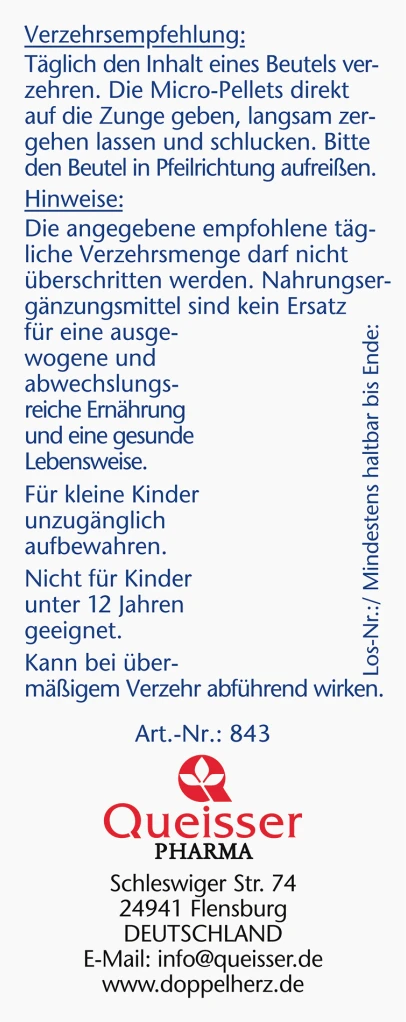 Täglich den Inhalt eines Beutels verzehren. Die Micro-Pellets direkt auf die Zunge geben, langsam zergehen lassen und schlucken.