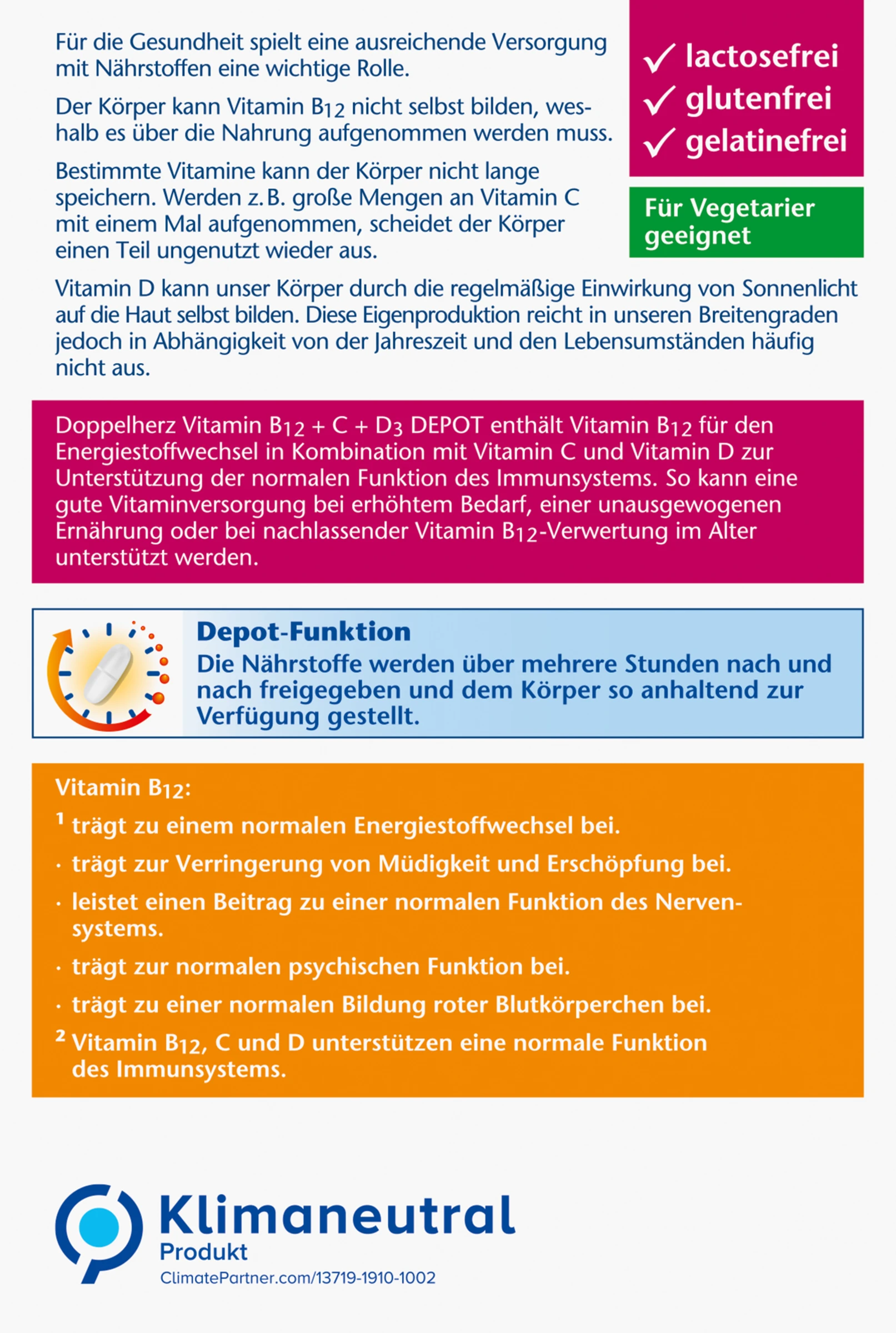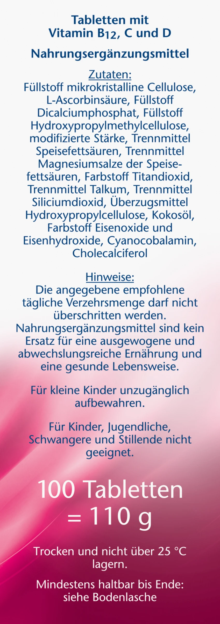 Füllstoff mikrokristalline Cellulose, L-Ascorbinsäure, Füllstoff Hydroxypropylmethylcellulose, modifizierte Stärke, Trennmittel Speisefettsäuren, Trennmittel Magnesiumsalze der Speisefettsäuren, Farbstoff Titandioxid, Trennmittel Talkum, Trennmittel Siliciumdioxid, Überzugsmittel Hydroxypropylcellulose, Kokosöl, Farbstoff Eisenoxide und Eisenhydroxide, Cyanocobalamin, Cholecalciferol.