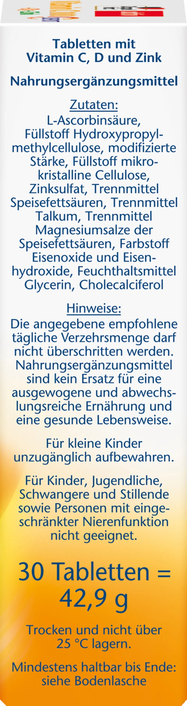 L-Ascorbinsäure, Füllstoff Hydroxypropylmethylcellulose, modifizierte Stärke, Füllstoff mikrokristalline Cellulose, Zinksulfat, Trennmittel Speisefettsäuren, Trennmittel Talkum, Trennmittel Magnesiumsalze der Speisefettsäuren, Farbstoff Eisenoxide und Eisenhydroxide, Feuchthaltsmittel Glycerin, Cholecalciferol
