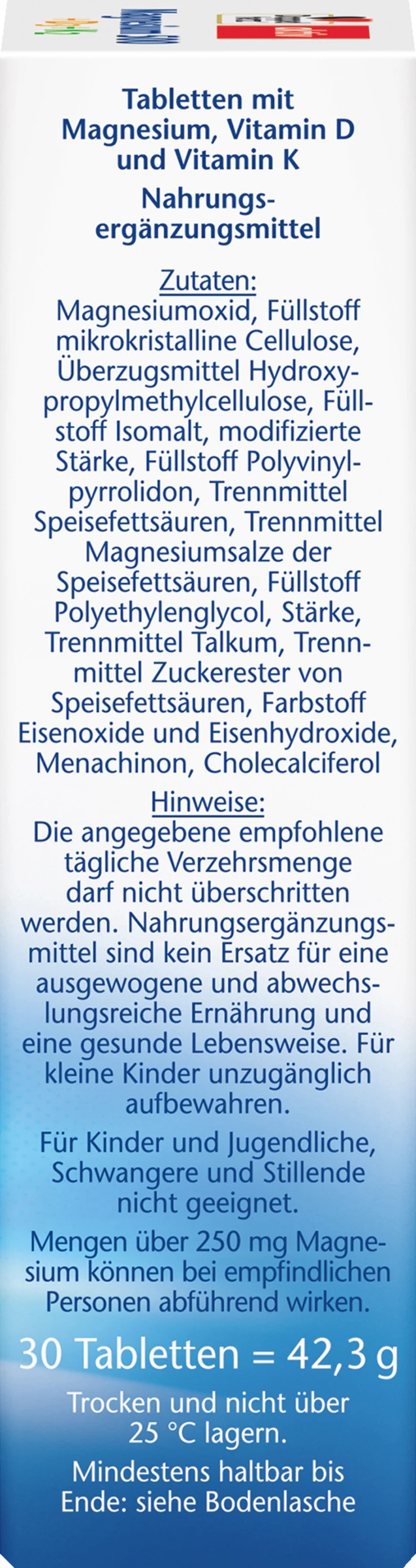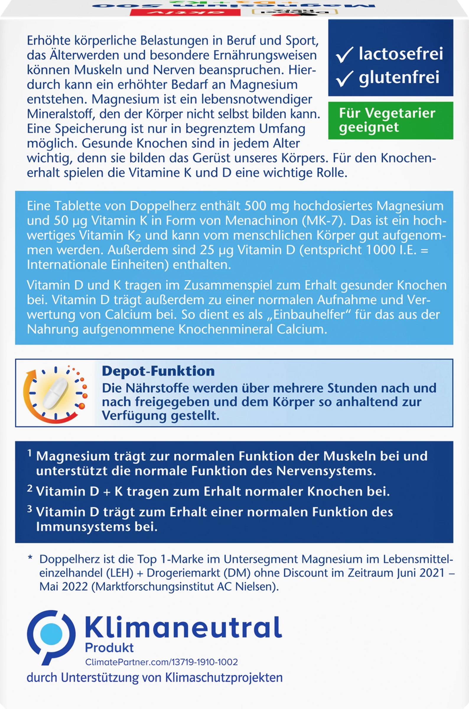 Erhöhte körperliche Belastungen in Beruf und Sport, das Älterwerden und besondere Ernährungsweisen können Muskeln und Nerven beanspruchen. Hierdurch kann ein erhöhter Bedarf an Magnesium entstehen. Magnesium ist ein lebensnotwendiger Mineralstoff, den der Körper nicht selbst bilden kann. Eine Speicherung ist nur in begrenztem Umfang möglich. Gesunde Knochen sind in jedem Alter wichtig, denn sie bilden das Gerüst unseres Körpers. Für den Knochenerhalt spielen die Vitamine K und D eine wichtige Rolle. Eine Tablette von Doppelherz enthält 500 mg hochdosiertes Magnesium und 50 µg Vitamin K in Form von Menachinon (MK-7). Das ist ein hochwertiges Vitamin K2 und kann vom menschlichen Körper gut aufgenommen werden. Außerdem sind 25 µg Vitamin D (entspricht 1000 I.E. = Internationale Einheiten) enthalten. Vitamin D und K tragen im Zusammenspiel zum Erhalt gesunder Knochen bei. Vitamin D trägt außerdem zu einer normalen Aufnahme und Verwertung von Calcium bei. So dient es als „Einbauhelfer“ für das aus der Nahrung aufgenommene Knochenmineral Calcium.