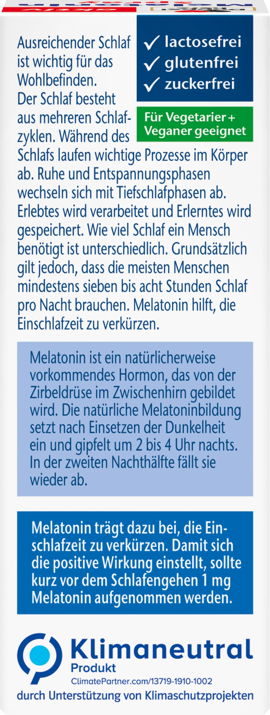 Ausreichender Schlaf ist wichtig für das Wohlbefinden. Der Schlaf besteht aus mehreren Schlafzyklen. Während des Schlafs laufen wichtige Prozesse im Körper ab. Ruhe und Entspannungsphasen wechseln sich mit Tiefschlafphasen ab. Erlebtes wird verarbeitet und Erlerntes wird gespeichert.Wie viel Schlaf ein Mensch benötigt ist unterschiedlich. Grundsätzlich gilt jedoch, dass die meisten Menschen mindestens sieben bis acht Stunden Schlaf pro Nacht brauchen. Melatonin hilft, die Einschlafzeit zu verkürzen.Melatonin ist ein natürlicherweise vorkommendes Hormon, das von der Zirbeldrüse im Zwischenhirn gebildet wird. Die natürliche Melatoninbildung steigt nach Einsetzen der Dunkelheit ein und gipfelt um 2 bis 4 Uhr nachts. Inder zweiten Nachthälfte fällt sie wieder ab.