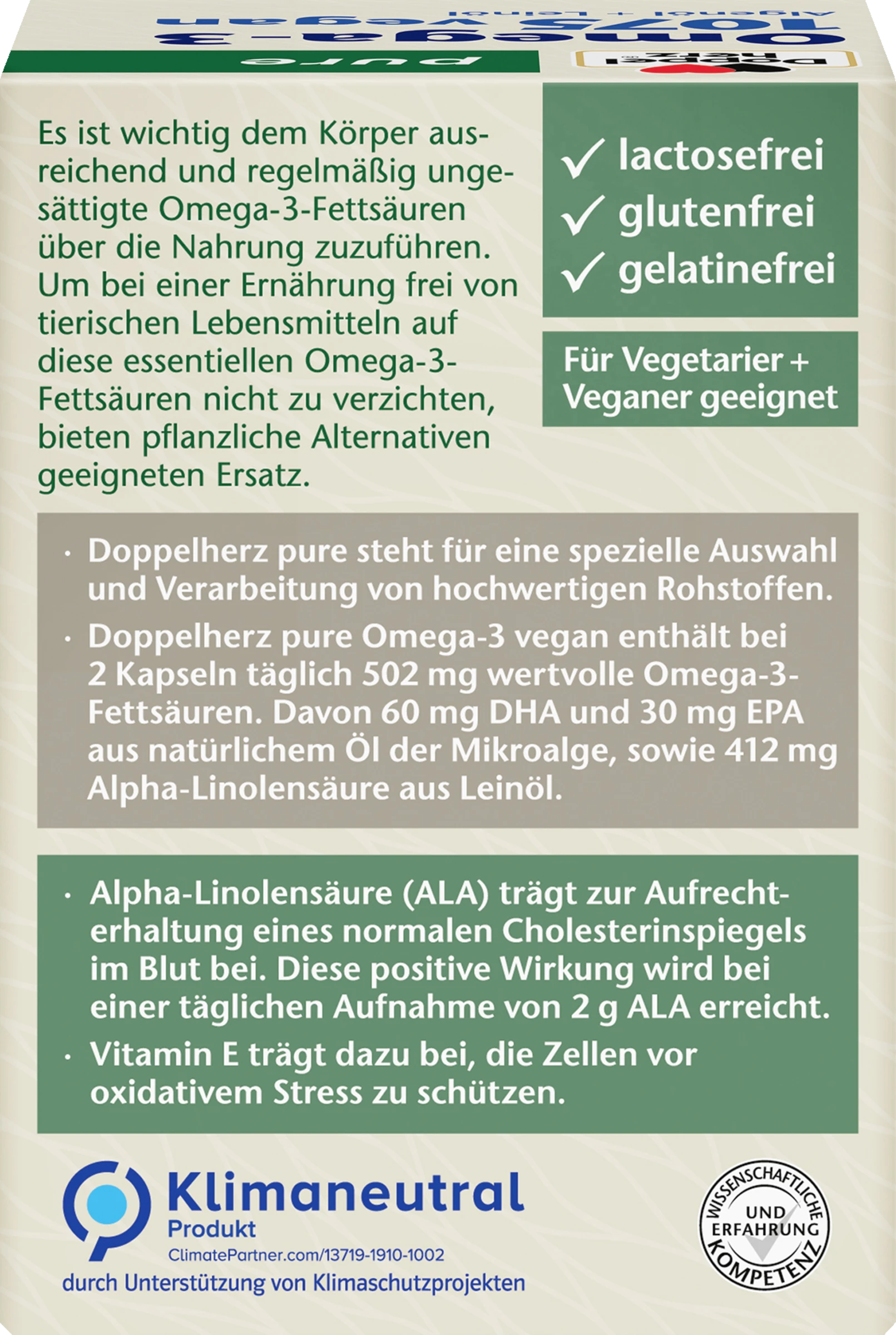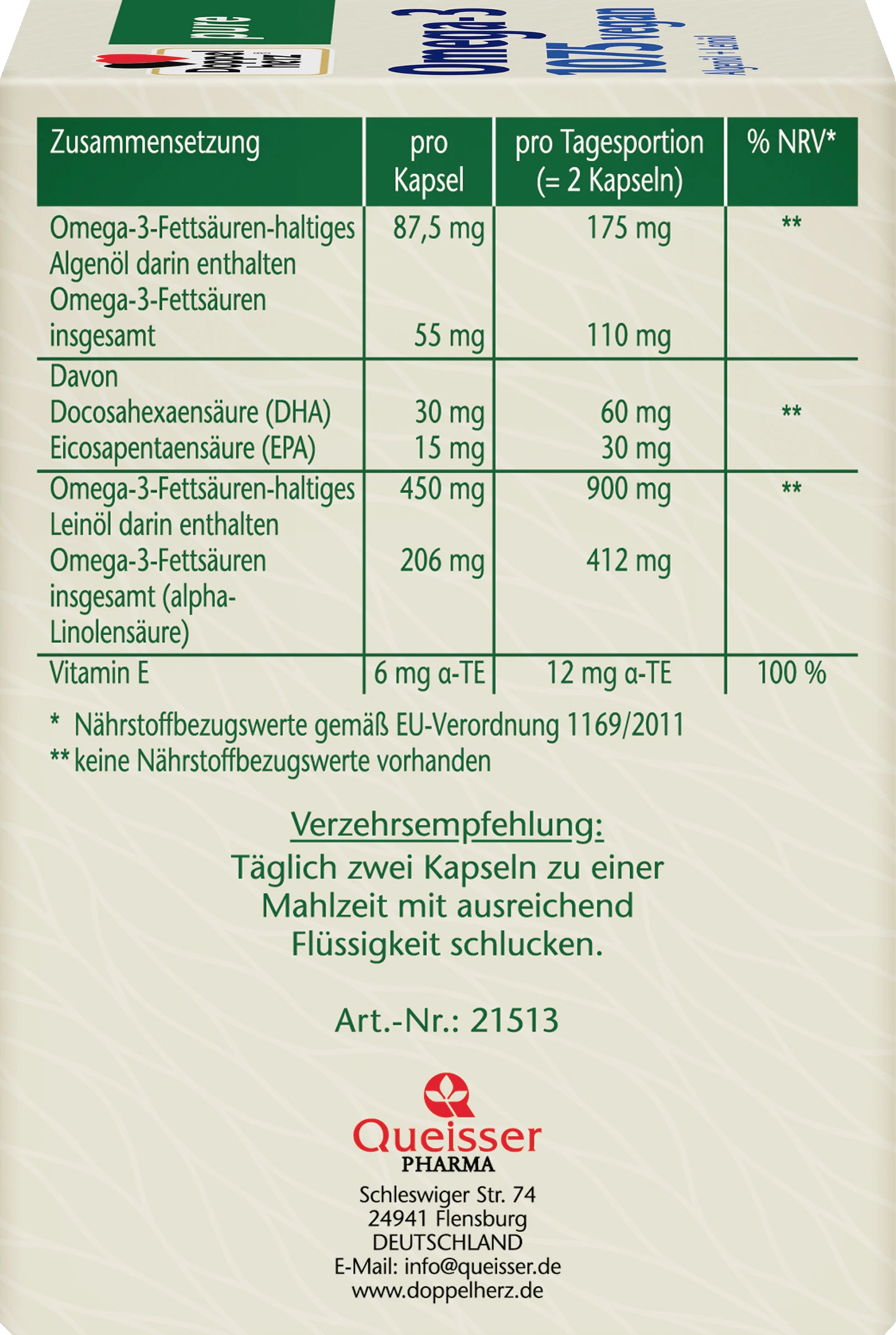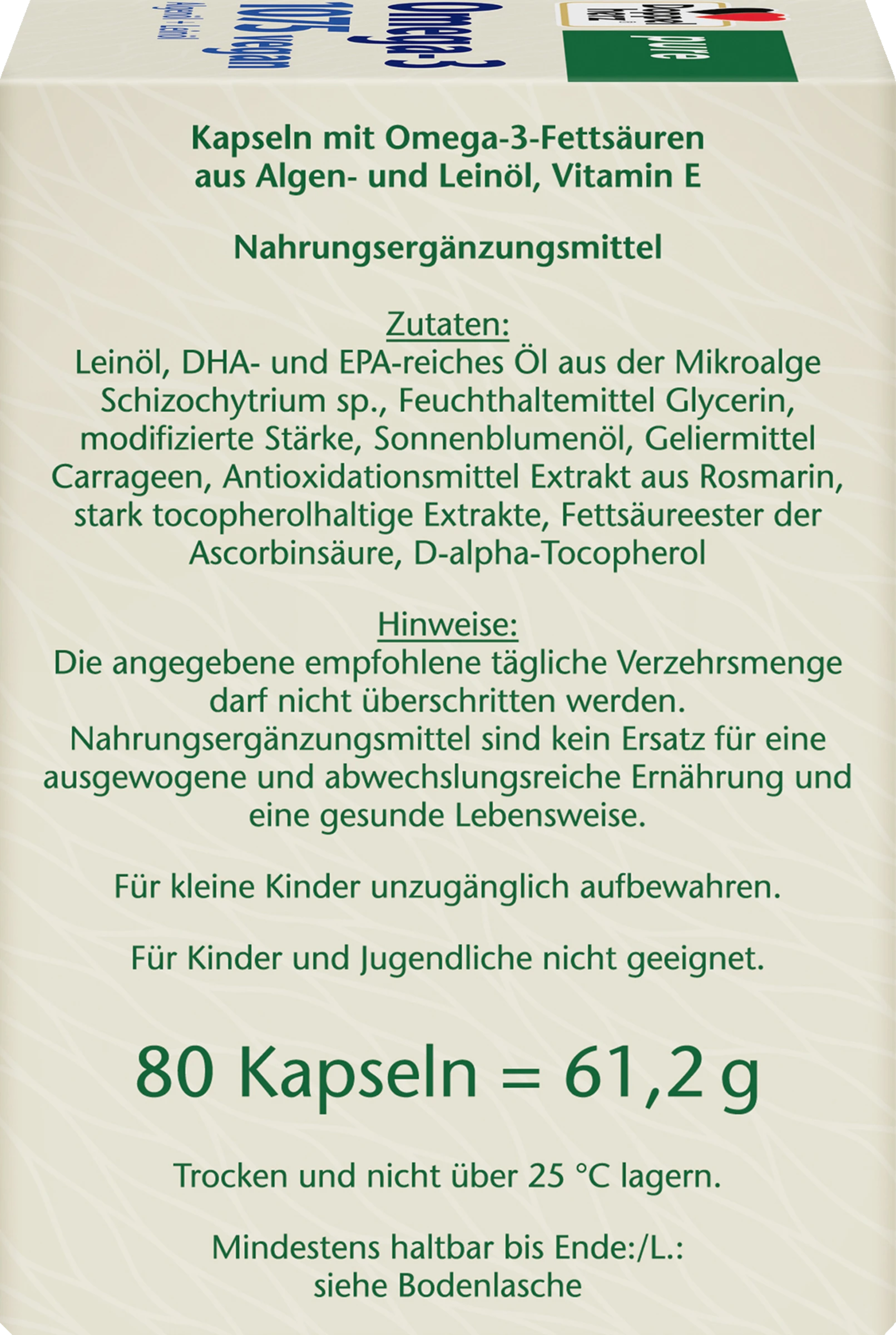 Leinöl, DHA- und EPA-reiches Öl aus der Mikroalge Schizochytrium sp., Feuchthaltemittel Glycerin, modifizierte Stärke, Sonnenblumenöl, Geliermittel Carrageen, Antioxidationsmittel Extrakt aus Rosmarin, stark tocopherolhaltige Extrakte, Fettsäureester der Ascorbinsäure, D-alpha-Tocopherol