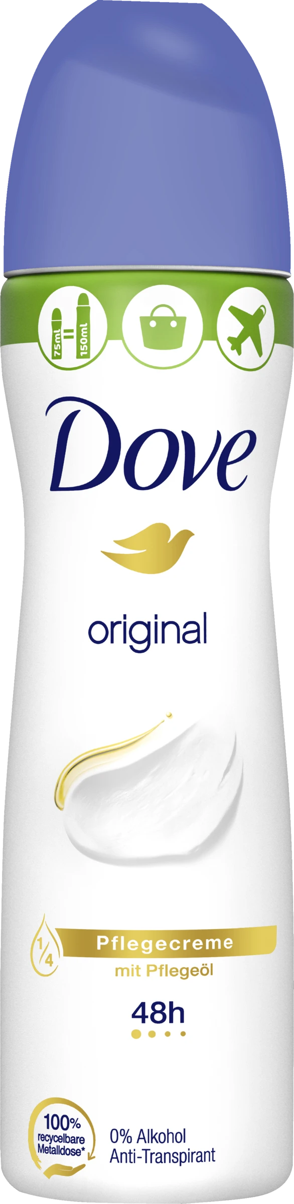 Ein Anti-Transpirant, auf das Verlass ist: Das Dove Anti-Transpirant Spray Original compressed bietet 48 Stunden Schutz mit dezentem Duft, der den ganzen Tag ein frisches und reines Gefühl verleiht. Das Deodorant Spray mit ¼ Pflegecreme hilft der Haut, sich schneller zu regenerieren und pflegt die zarte Achselhaut schön weich und glatt.