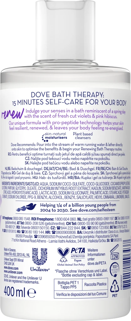 Das Bad & Duschgel von Dove sorgt mit hochwertiger 3-fach-Pflege für schöne Haut. Der Badeschaumzusatz enthält eine Pro-Peptide-Technologie (12-HSA), welche die Peptidbildung in der Haut anregt und somit die Hautregeneration unterstützt. Hautnatürliche Feuchtigkeitsspender binden Feuchtigkeit in der Haut, um trockene Haut zu verhindern. Dank der Premium-Inhaltsstoffe verleiht das Dove Bad & Duschgel Frauen einen 15-minütigen Self-Care-Moment für den Körper. Der langanhaltende Duft nach wildem Veilchen und pinkem Hibiskus verwöhnt die Sinne und sorgt für ein verwöhnendes Badeerlebnis. Das Dove Bad & Dusch Gel ist pH-neutral und ohne Sulfat SLES.