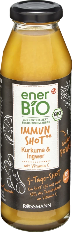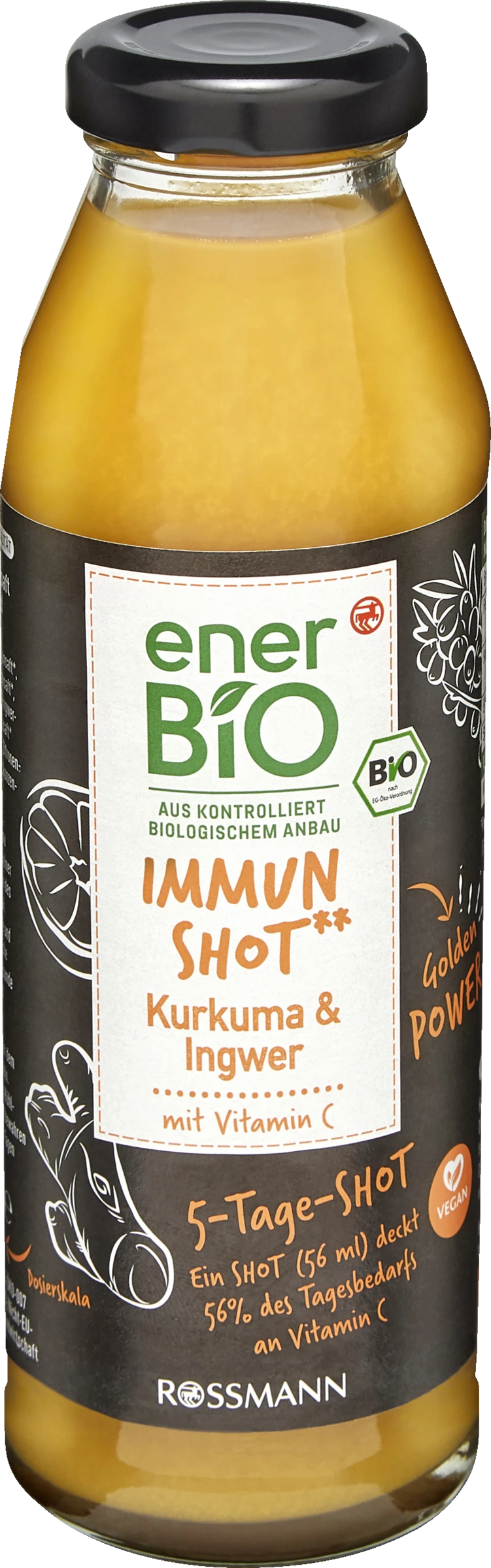 Jede Menge Kurkuma-Boost von Montag bis Freitag: Oder von Mittwoch bis Sonntag? Unser enerBiO Immunshot mit Kurkuma und Ingwer bringt Golden Power in fünf aufeinander folgende Tage Ihrer Woche. Mit 56% des Tagesbedarfs an Vitamin C, fruchtigen Orangen, Sanddorn, Kurkuma, Ingwer und einer leicht scharfen Pfeffernote erhält Ihr Immunsystem genau das, was es braucht.