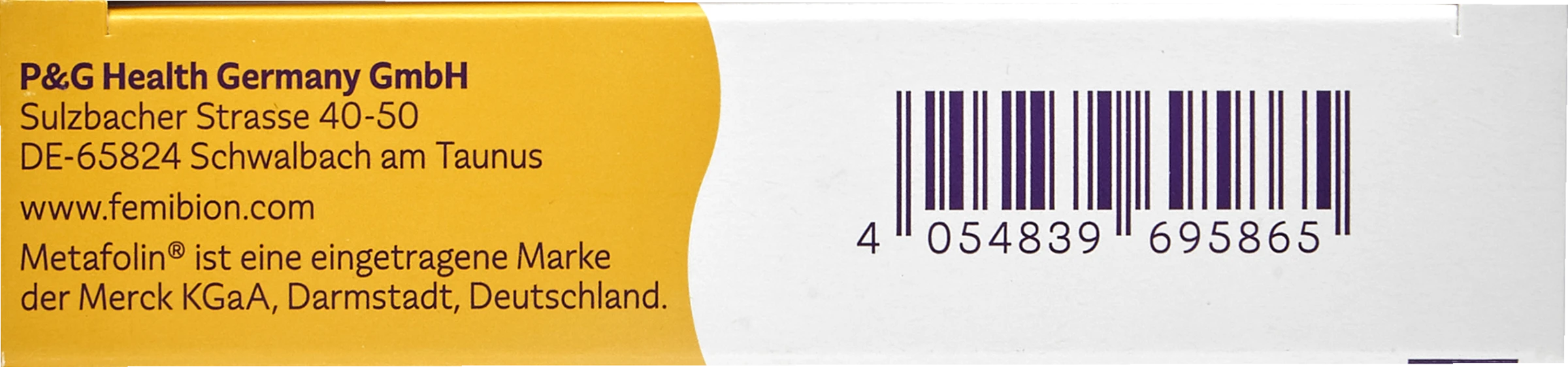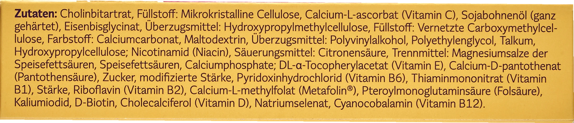 Cholinbitartrat, Füllstoff: Mikrokristalline Cellulose, Calcium-L-ascorbat (Vitamin C), Sojabohnenöl (ganz gehärtet), Eisenbisglycinat, Überzigsmittel: Hydroxypropylmethycellulose: Füllstoff: Vernetzte Carboxymethylcellulose; Farbstoff: Calciumcarbonat, Maltodextrin; Überzeugsmittel: Polyvinylalkohol, Polyethylenglycol, Talkum, Hydroxypropylcellulose; Nicotinamid (Niacin); Säuerungsmittel: Citronensäure; Trennmittel: Magnesiumsalze der Speisefettsäuren, Speisefettsäuren, Calciumphosphate; DL-a-Tocopherylacetat (Vitamin E), Calcium-D-pantothenat (Pantothensäure), Zucker, modifizierte Stärke, Pyridoxinhydrochlorid (VItamin B6), Thiaminmononitrat (Vitamin B1), Stärke, Riboflavin (Vitamin B2), Calcium-L-methylfolat (Metafolin), Pteroylmonoglutaminsäure (Folsäure), Kaliumiodid, D-Biotin, Cholecalciferol (Vitamin D), Natriumselenat, Cyanocobalamin (Vitamin B12)