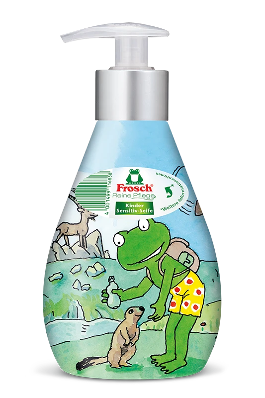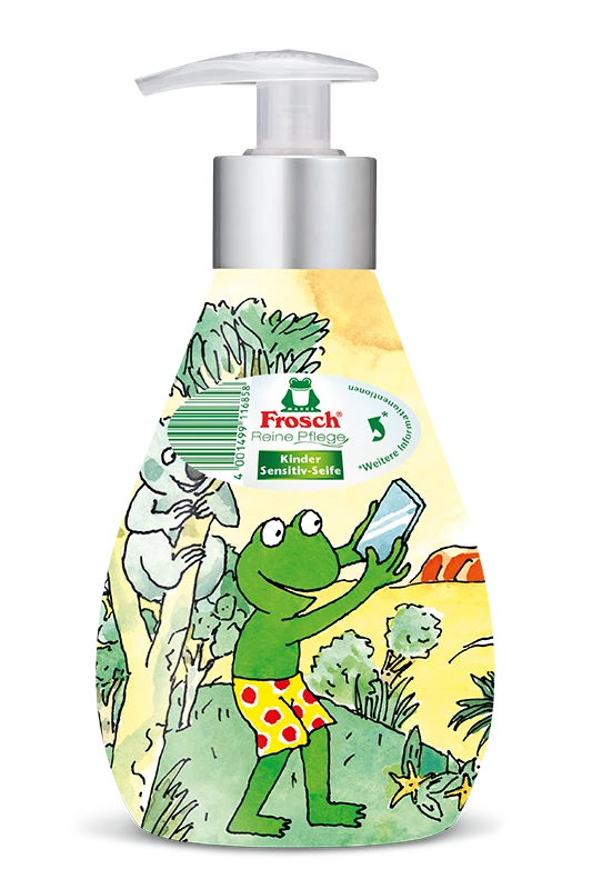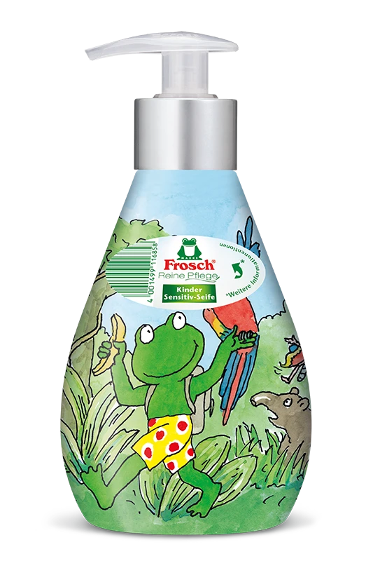 Die Frosch Reine Pflege Kinder Sensitiv-Seife mit ihrer sanft-pflegenden Rezeptur reinigt sensible Haut und schützt sie dank ihrer sensitiven und feuchtigkeitsspendenden Inhaltsstoffe bei jedem Händewaschen vor dem Austrocknen. Die pH-hautneutrale und dermatologisch getestete Kinderseife verzichtet auf Farbstoffe und unterstützt mit ihren wertvollen, rückfettenden Eigenschaften den natürlichen Säureschutzmantel von sensibler Kinderhaut. Die Frosch Reine Pflege Kinder Sensitiv-Seife ist in der dekorativen, wiederbefüllbaren Designflasche mit fünf unterschiedlichen Frosch-Motiven bedruckt.