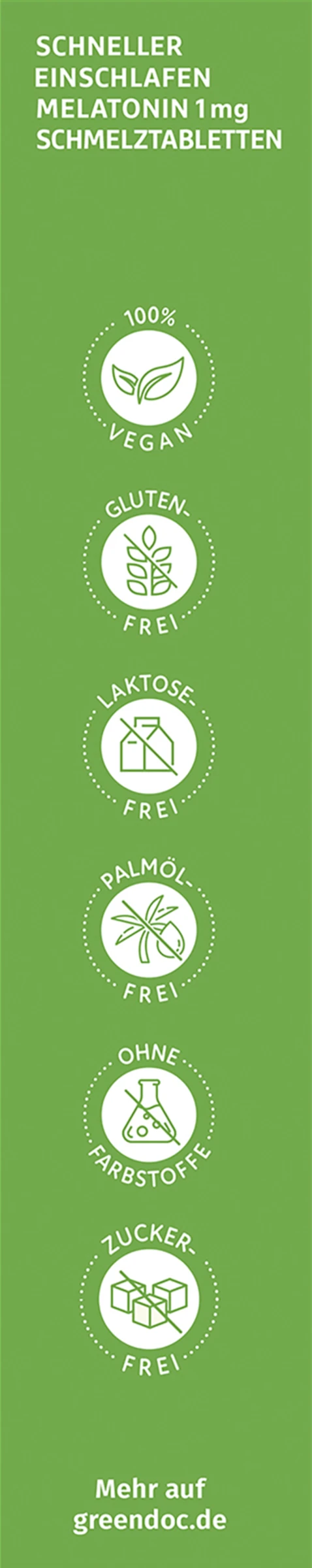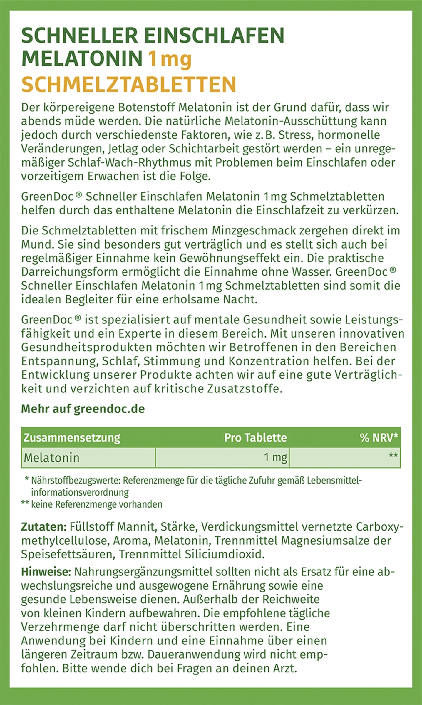 Der körpereigene Botenstoff Melatonin ist der Grund dafür, dass wir abends müde werden. Die natürliche Melatonin Ausschüttung kann jedoch durch verschiedenste Faktoren, wie z. B. Stress, hormonelle Veränderungen, Jetlag oder Schichtarbeit gestört werden – ein unregelmäßiger Schlaf-Wach-Rhythmus mit Problemen beim Einschlafen oder vorzeitigem Erwachen ist die Folge. GreenDoc ® Schneller Einschlafen Melatonin 1 mg Schmelztabletten helfen durch das enthaltene Melatonin die Einschlafzeit zu verkürzen.