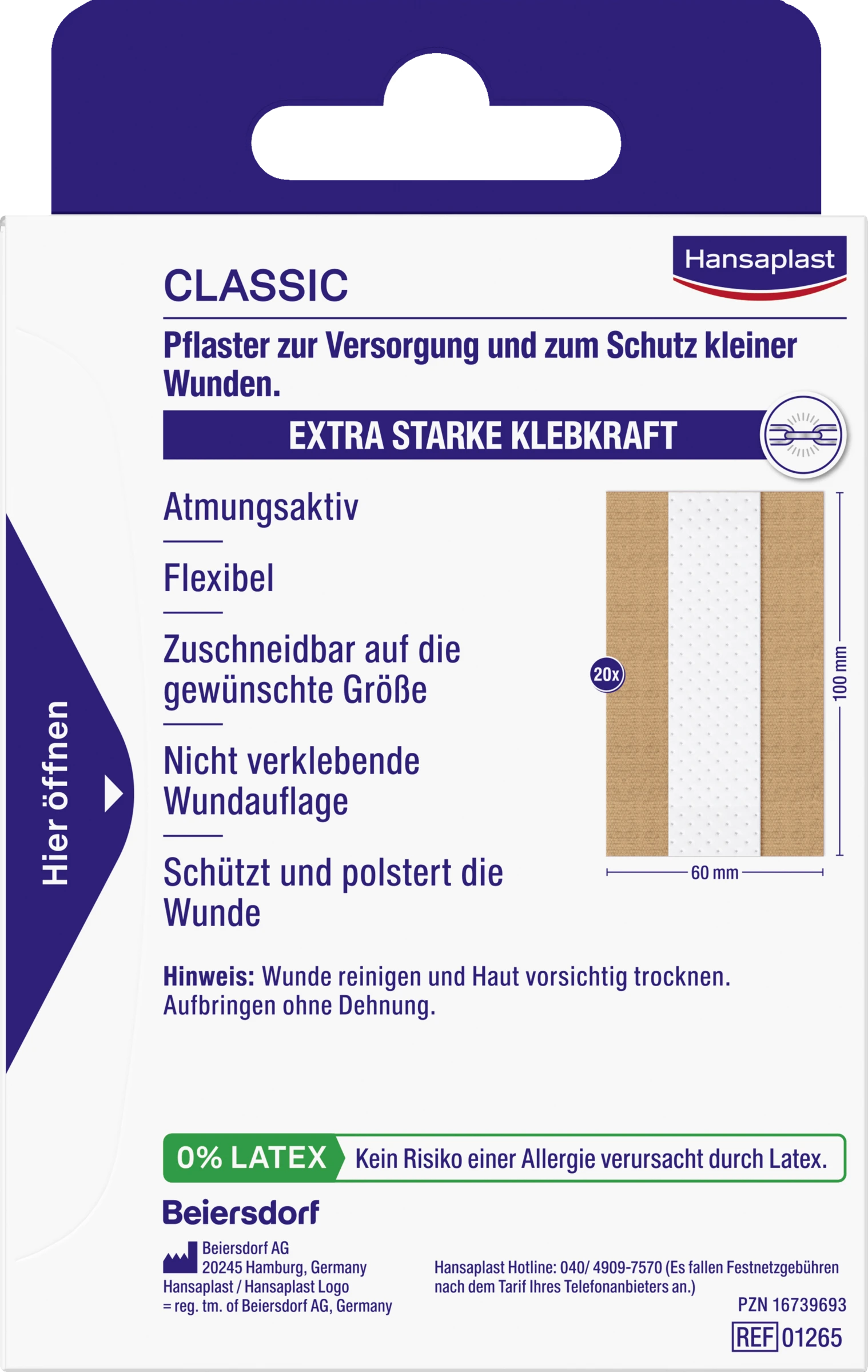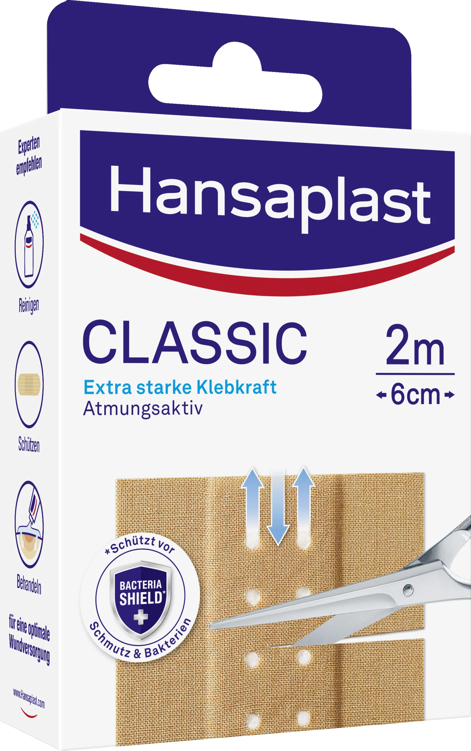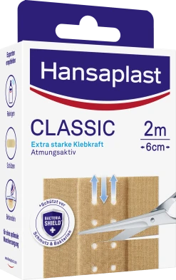 Das Hansaplast Classic Pflaster ist für jede Art von Wunde oder kleinerer Verletzung geeignet. Die nicht verklebende Wundauflage schützt und polstert die Wunde zuverlässig vor äußeren Einflüssen, wie Schmutz und Bakterien, um eine ungestörte Heilung zu ermöglichen. Das Material ist zudem besonders widerstandsfähig und die extra starke Klebkraft sorgt dafür, dass das Pflaster zuverlässig auf der Haut haftet. Das Hansaplast Classic erhalten Sie als praktische Meterware – so können Sie sich die benötigte Größe einfach mit einer Schere individuell zuschneiden.