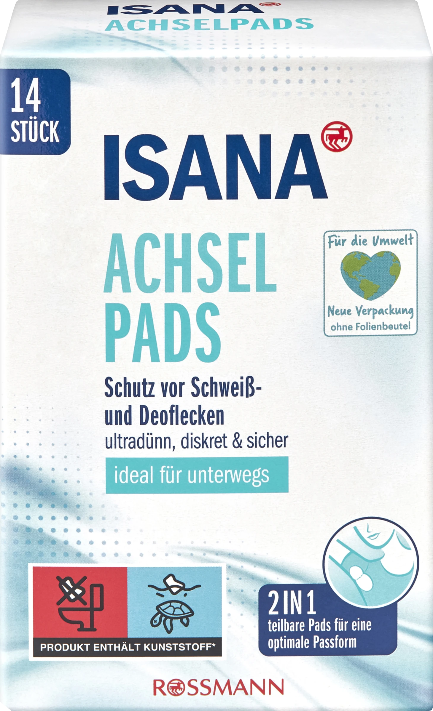 HINWEIS: Pads nach dem Tragen und vor dem Waschen oder Reinigen aus der Kleidung entfernen. Pads sind nur für den einmaligen Gebrauch bestimt. Pads immer vorsichtig aus der Kleidung entfernen. Eine Anwendung von ISANA Achselpads auf langfaserigen oder sehr empfindlichen Textilien wird nicht empfohlen. ISANA Achselpads nur auf Textilien und nicht auf die Haut kleben. Nicht auf gereizter oder verletzter Haut verwenden. Verwendung abbrechen, falls Hautirritationen auftreten. Pads nicht über die Toilette entsorgen.