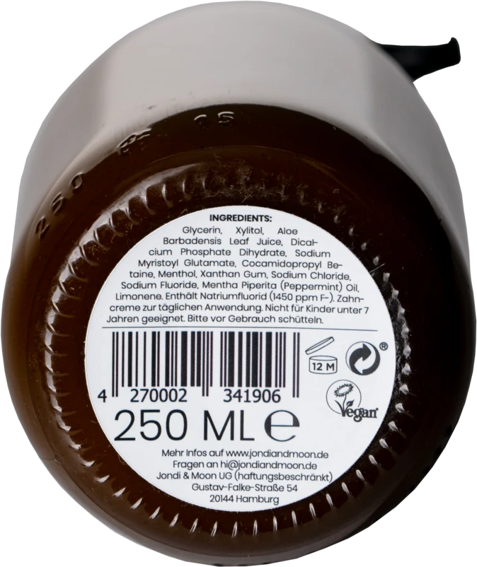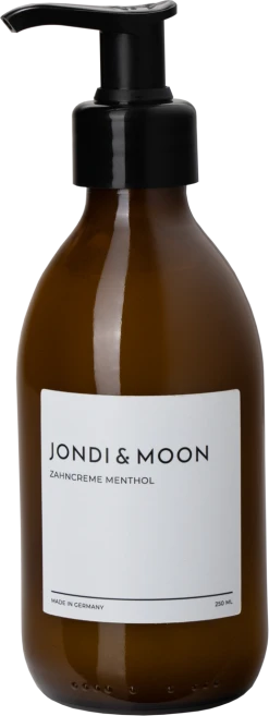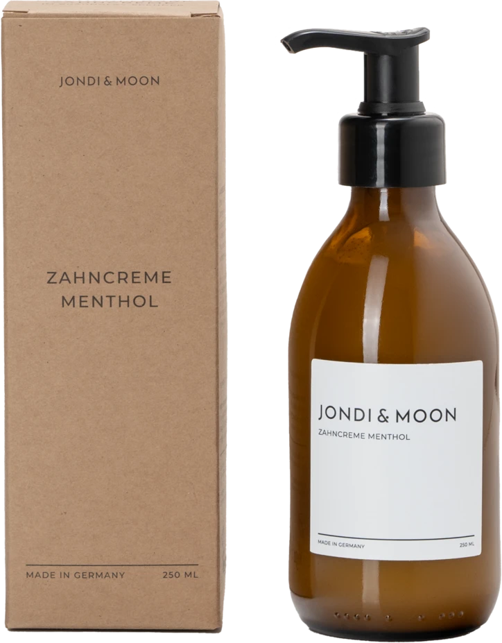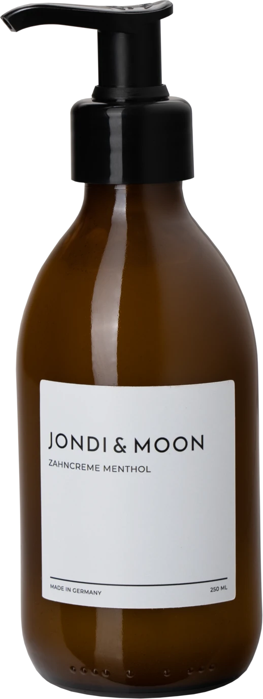 Die JONDI&MOON Zahncreme Menthol ist die erste nachfüllbare Zahncreme. Sie befindet sich in einem 250 ml Braunglas und kann mit dem zu 100% recycelbaren JONDI&MOON Nachfüllbeutel beliebig oft aufgefüllt werden. Durch die cremige Textur lässt sich die Zahncreme einfach umfüllen. Mit dem neuen Refill-System sparst Du im Vergleich zu herkömmlichen Zahnpasta-Tuben bis zu 92% Plastik ein. Die Zahncreme ist vegan und zu 98,85% aus Inhaltsstoffen natürlichen Ursprungs. Dadurch ist sie sanft zum Zahnfleisch, ohne aggressive Schäumer oder Abrasive, während sie einen natürlichen Schaumbildner auf Kokos-Basis enthält. Das enthaltene Menthol sorgt für eine langanhaltende Frische.