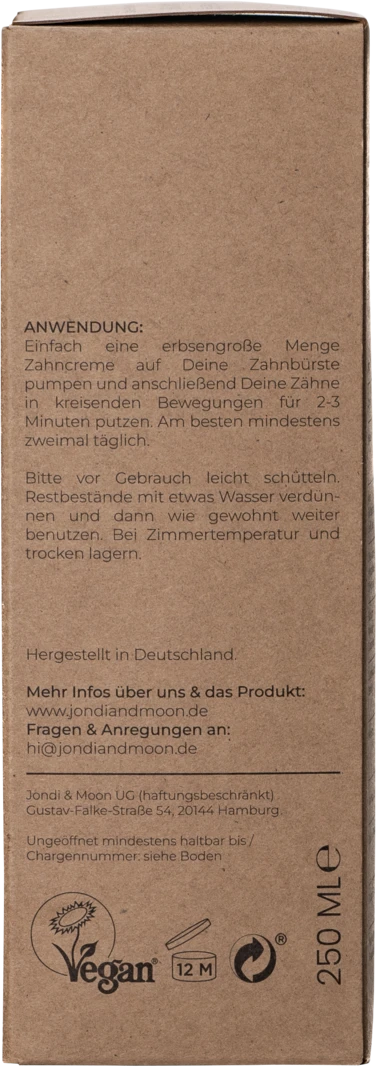 Einfach den Pumper betätigen – bei dem 250 ml Glas empfehlen wir einen kleinen Pumpstoß – und eine erbsengroße Menge Zahncreme auf Deine Zahnbürste verteilen und Deine Zähne in kreisenden Bewegungen für 2-3 Minuten putzen. Am besten mindestens zweimal täglich. Bitte vor Gebrauch schütteln. Restbestände mit etwas Wasser verdünnen und dann wie gewohnt weiter benutzen.
