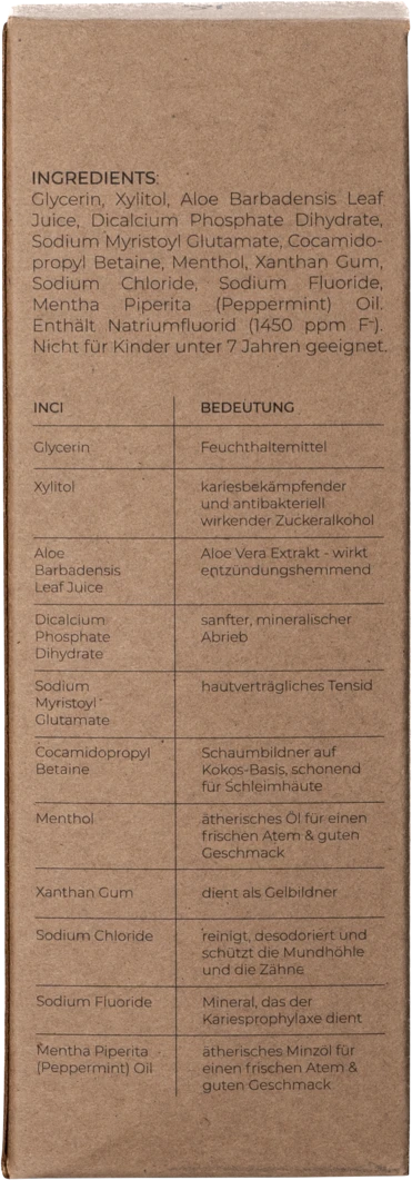 Durch natürliches Pfefferminzöl und ein wenig Menthol bekommt die Zahncreme eine angenehme Frische. Mehr Aromen braucht es gar nicht.